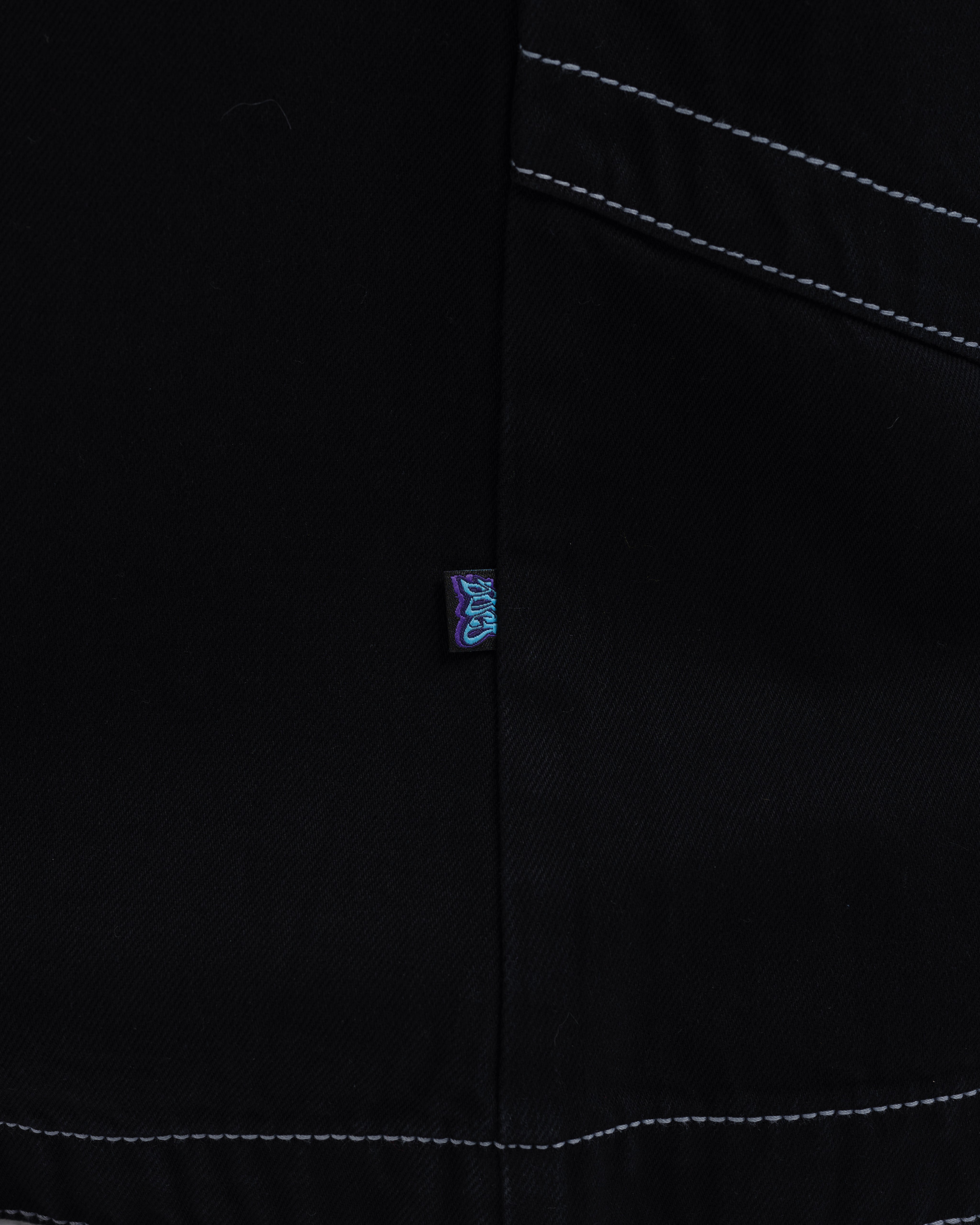 Collector’s item from the original JNCO “Roots” line. Jet Black denim, 34" bottom opening. 13oz rope-dyed 100% cotton with a luxe starch wax finish. Heavy double contrast stitching. Oversized back pockets with JNCO logo and “hangin’ tagger” embroidery. Original labels and collectible metallic flasher. Limited Edition – very limited stock.