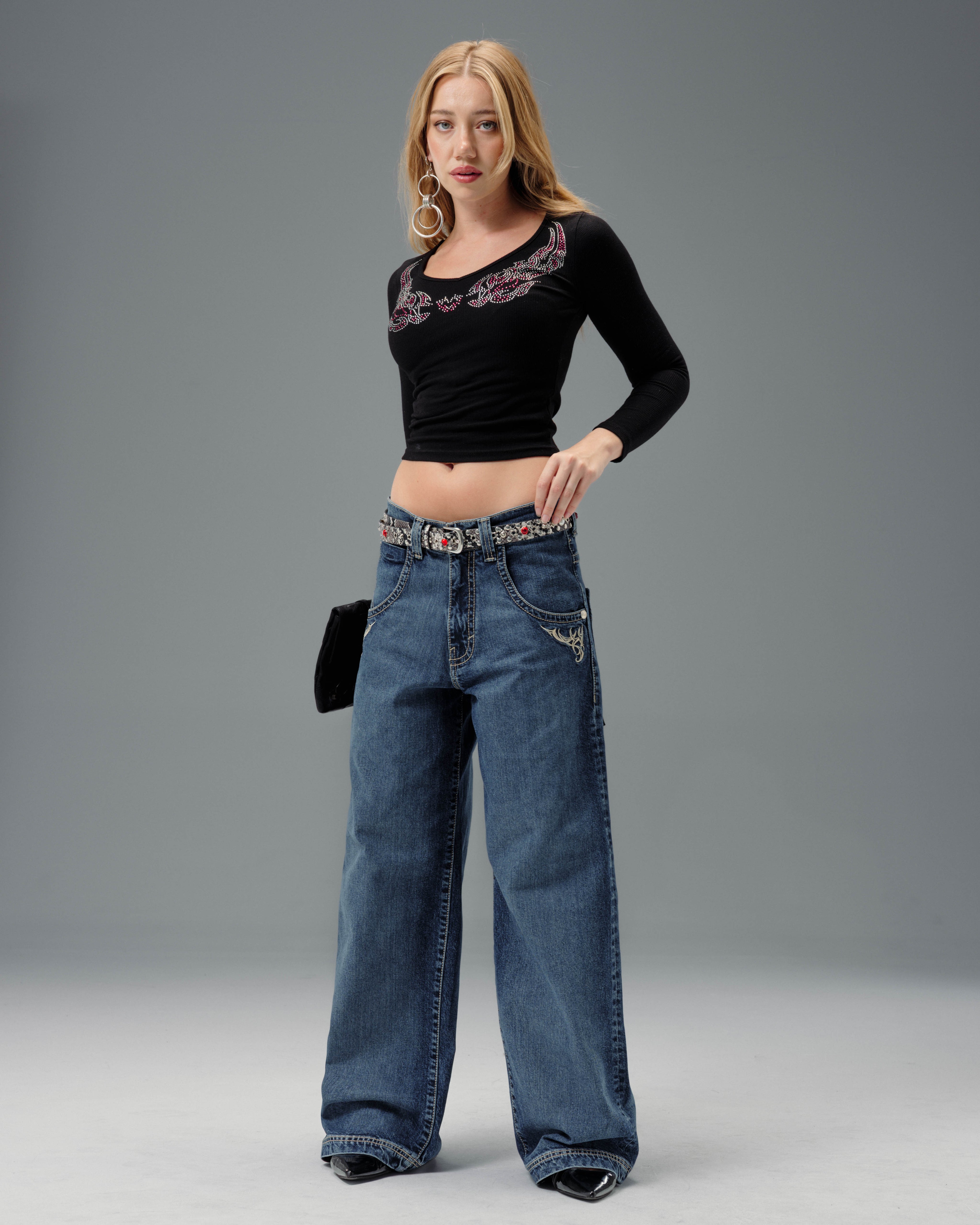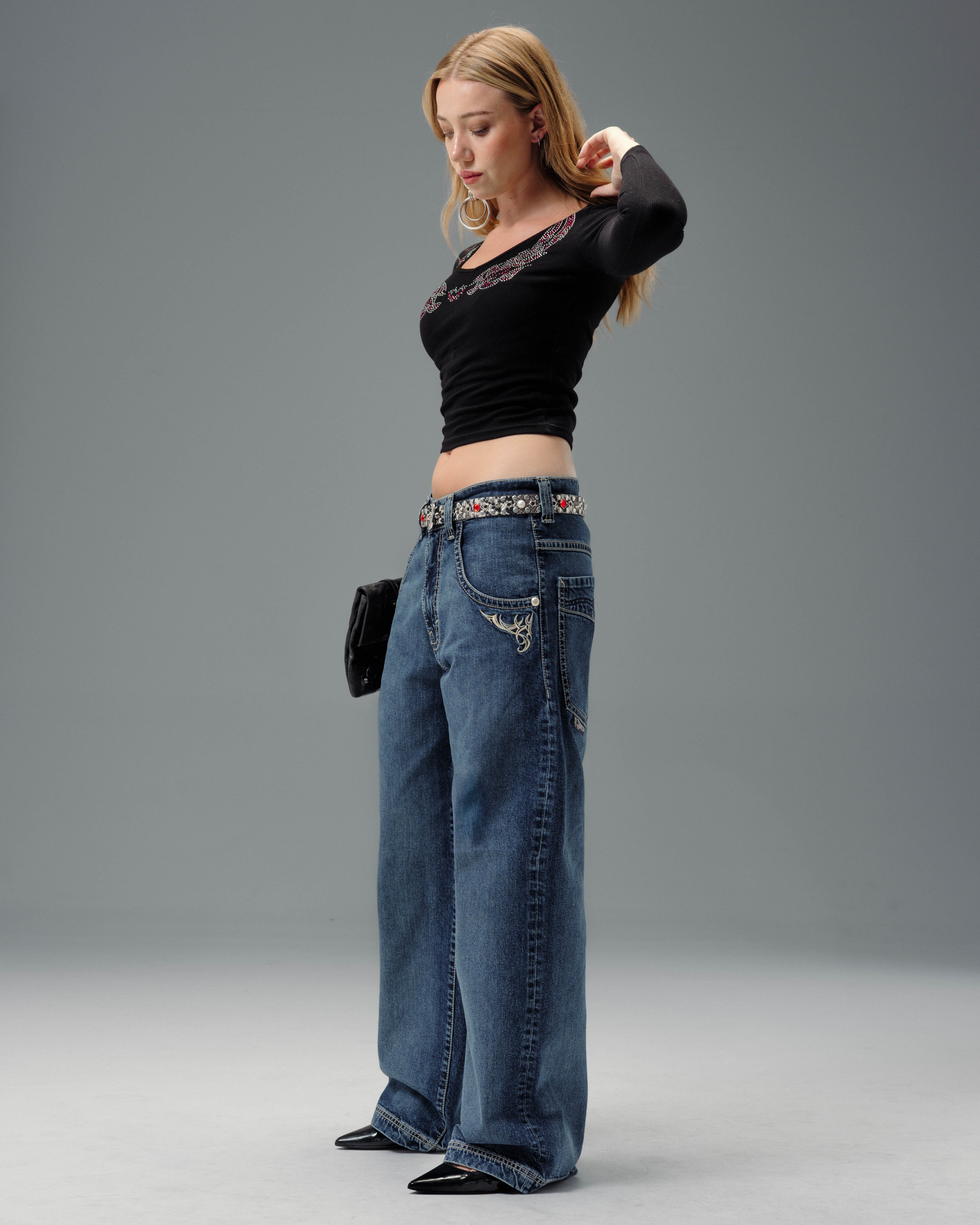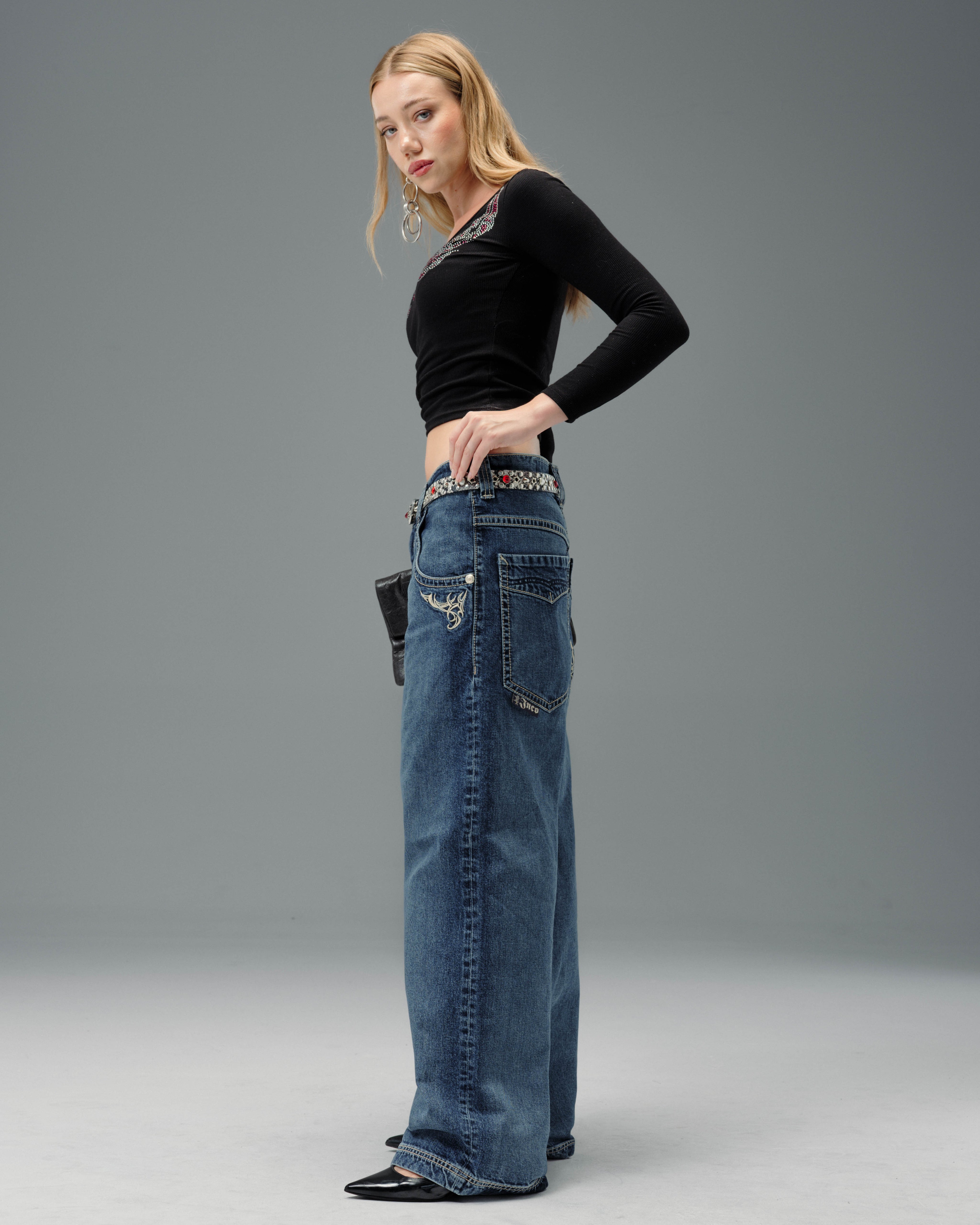 From the famous Tribal Collection. 13oz ring-spun denim in a Hand-Sand Dark Stone Wash with rich marbled character and an authentic, retro-inspired finish. 23" bottom opening with contrast stitching and a classic wide-leg fit. Features Celtic-inspired tribal embroidery on back pocket in pale white gold metallic thread, with indigo-accented hems, front corner details, and a signature four-suit rivet. Collectible flasher included.