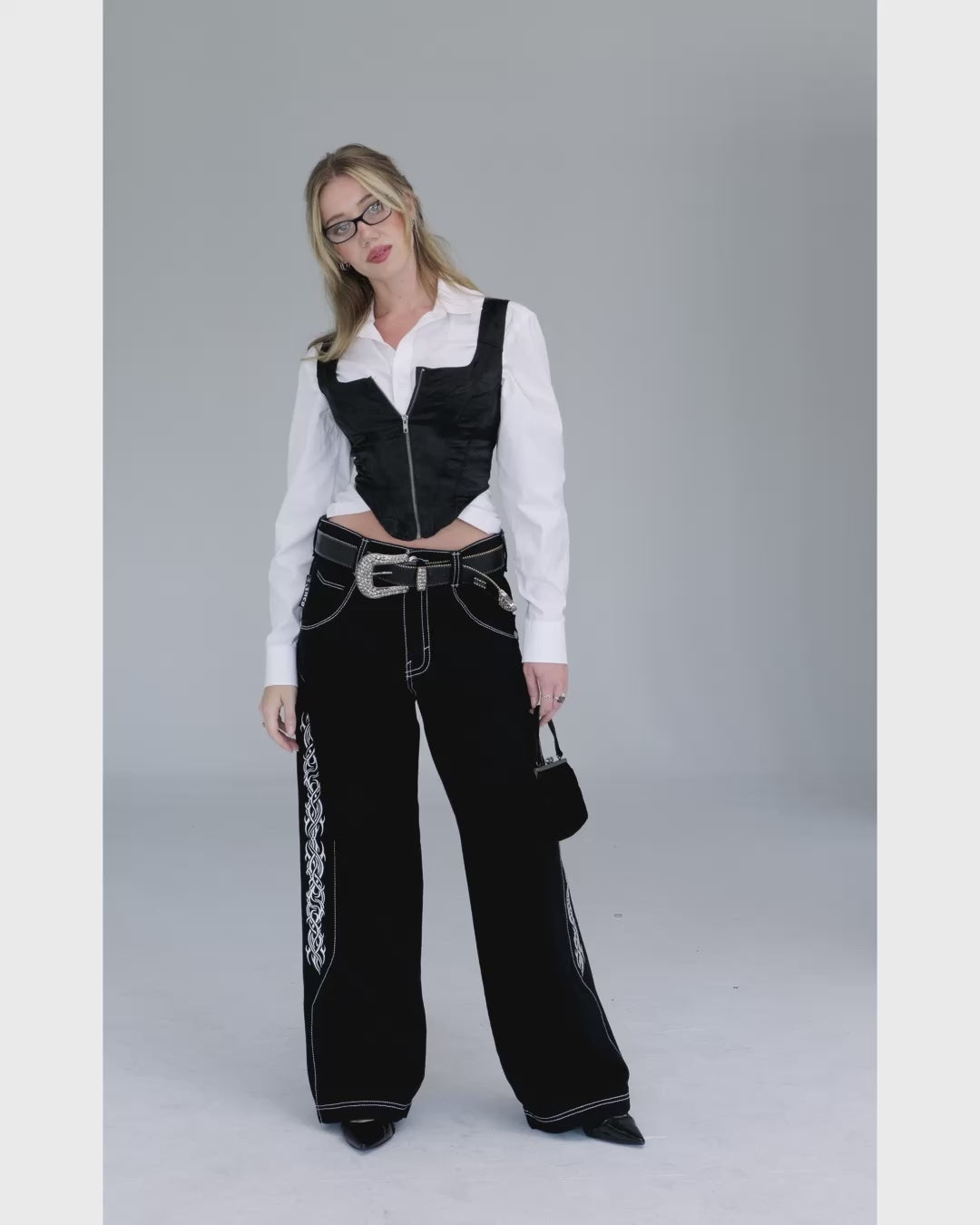 From the famous Tribal Collection. 13.5oz ring-spun denim in a sleek Jet Black wash with a structured, smooth silhouette. 23" bottom opening with contrast stitching and engineered side seams. Features over 120,000 embroidered stitches, including long vertical tribal graphics, Celtic-inspired logos on the back pockets, and heritage crown symbolism. Two-tone off-white and indigo thread adds depth to pocket details, reinforced with angled double stitching. Finished with premium custom hardware. Collectible flasher included.