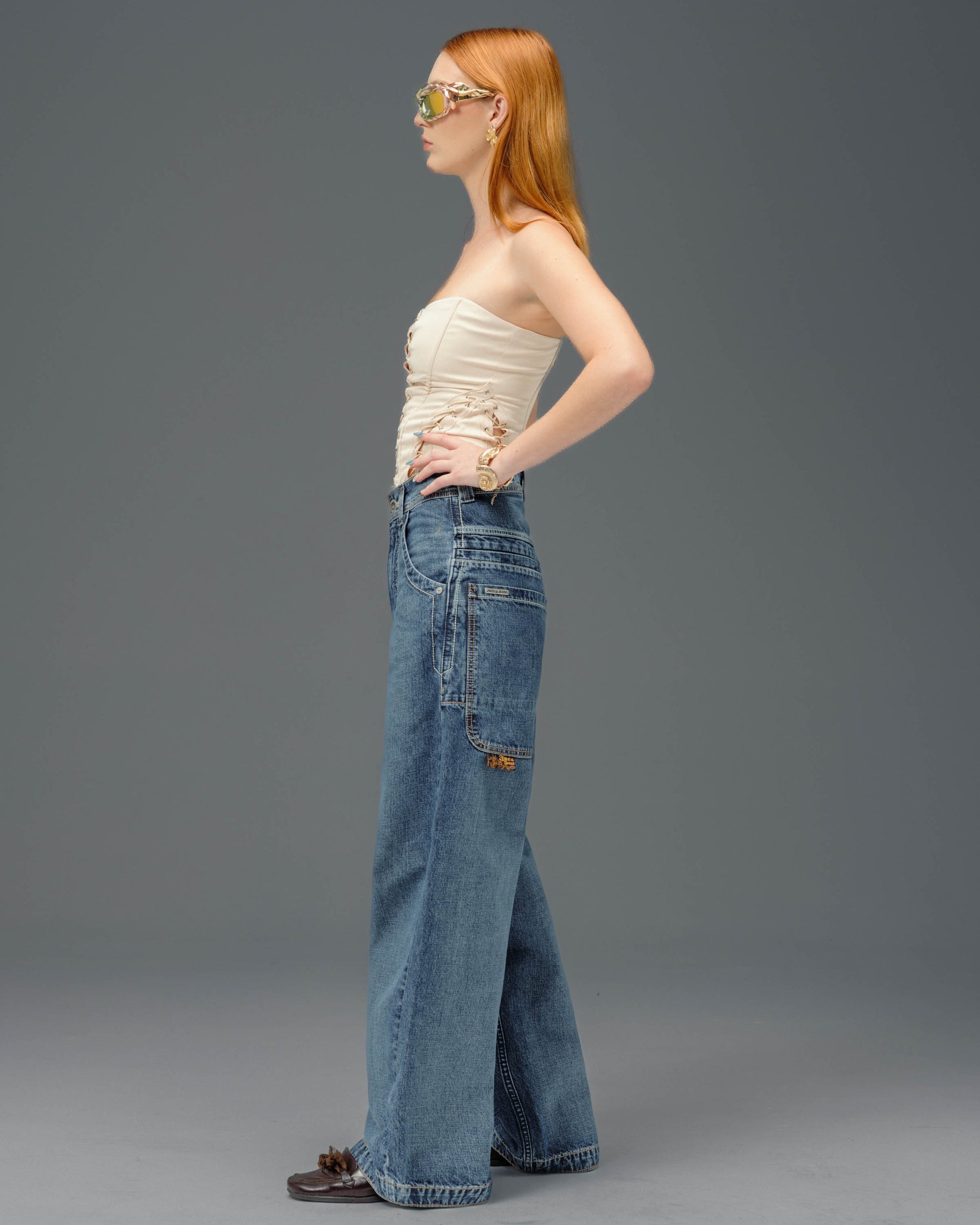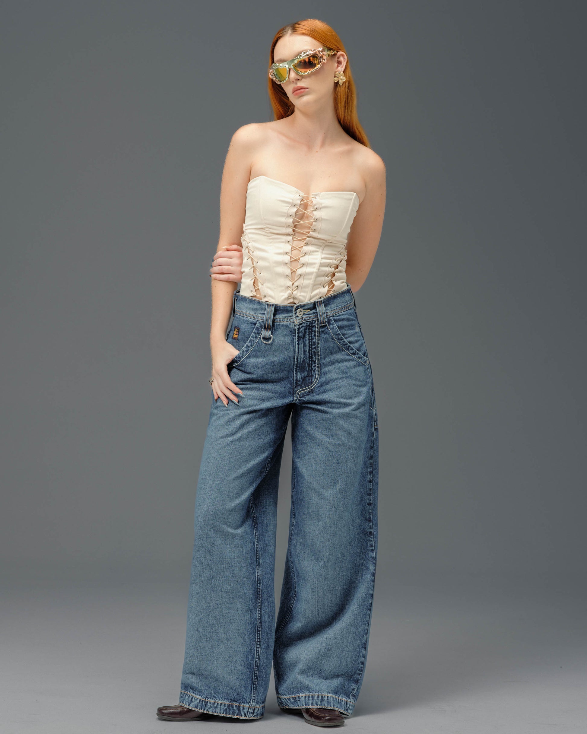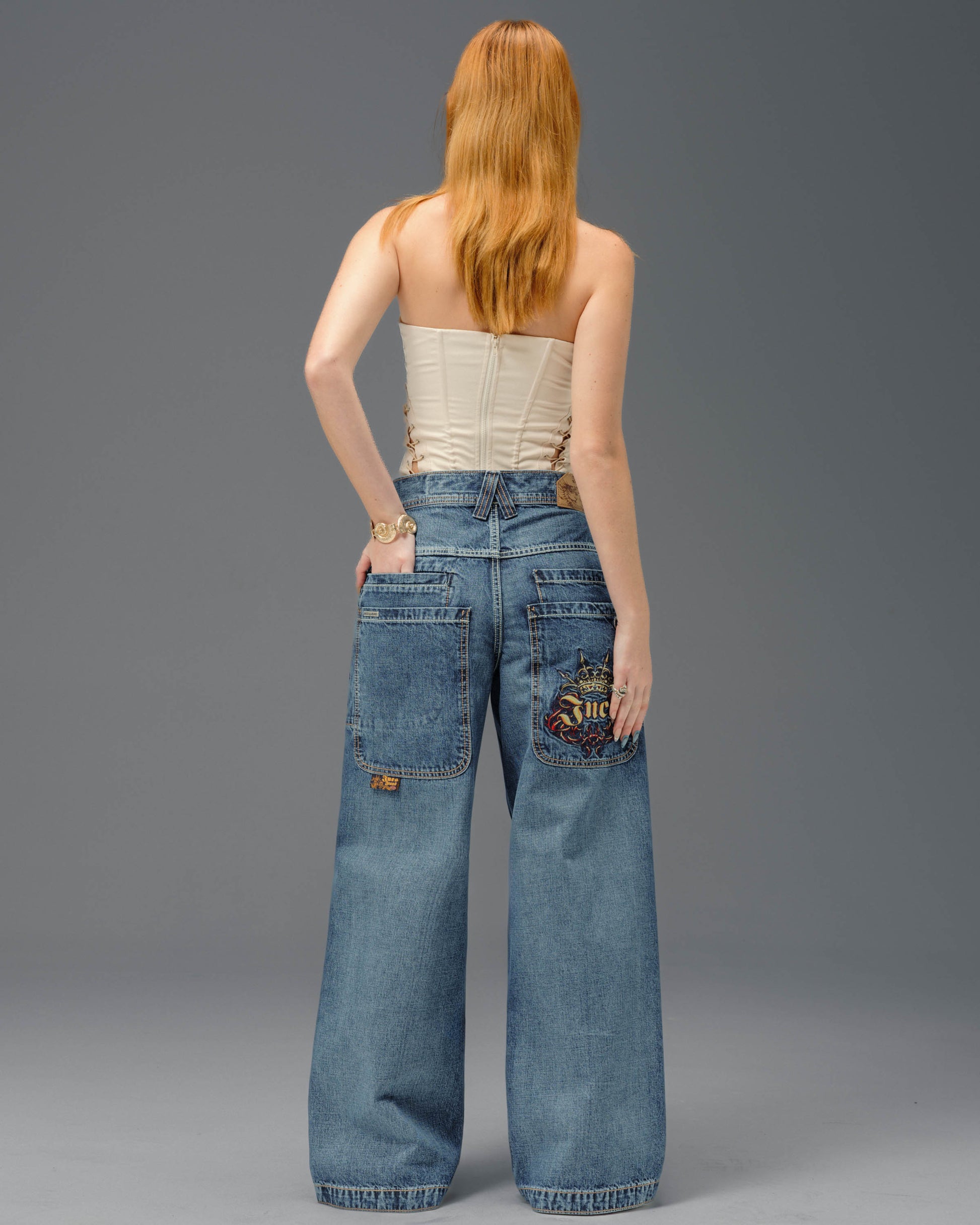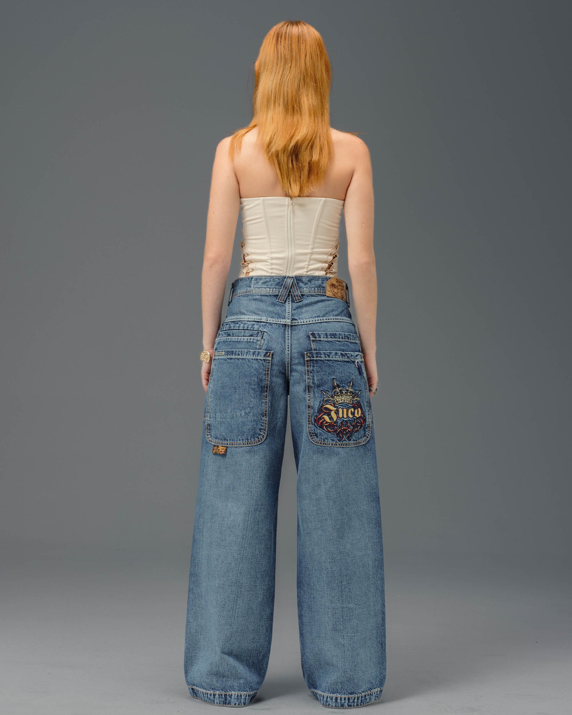 Collector’s item from JNCO’s workwear-inspired line. Hand-Sand Medium Dark Stone Wash, 23" bottom opening. 12.5oz 100% cotton cross-hatch denim with four-thread contrast stitching. 4 back pockets, “JNCO Jeans '85” dragon patch, crown plaque, and chain loops (chain not included). Original “JNCO Royal” embroidery with 80,000 stitches. Collectible matte and gloss flasher included. Limited Edition – very limited stock.
