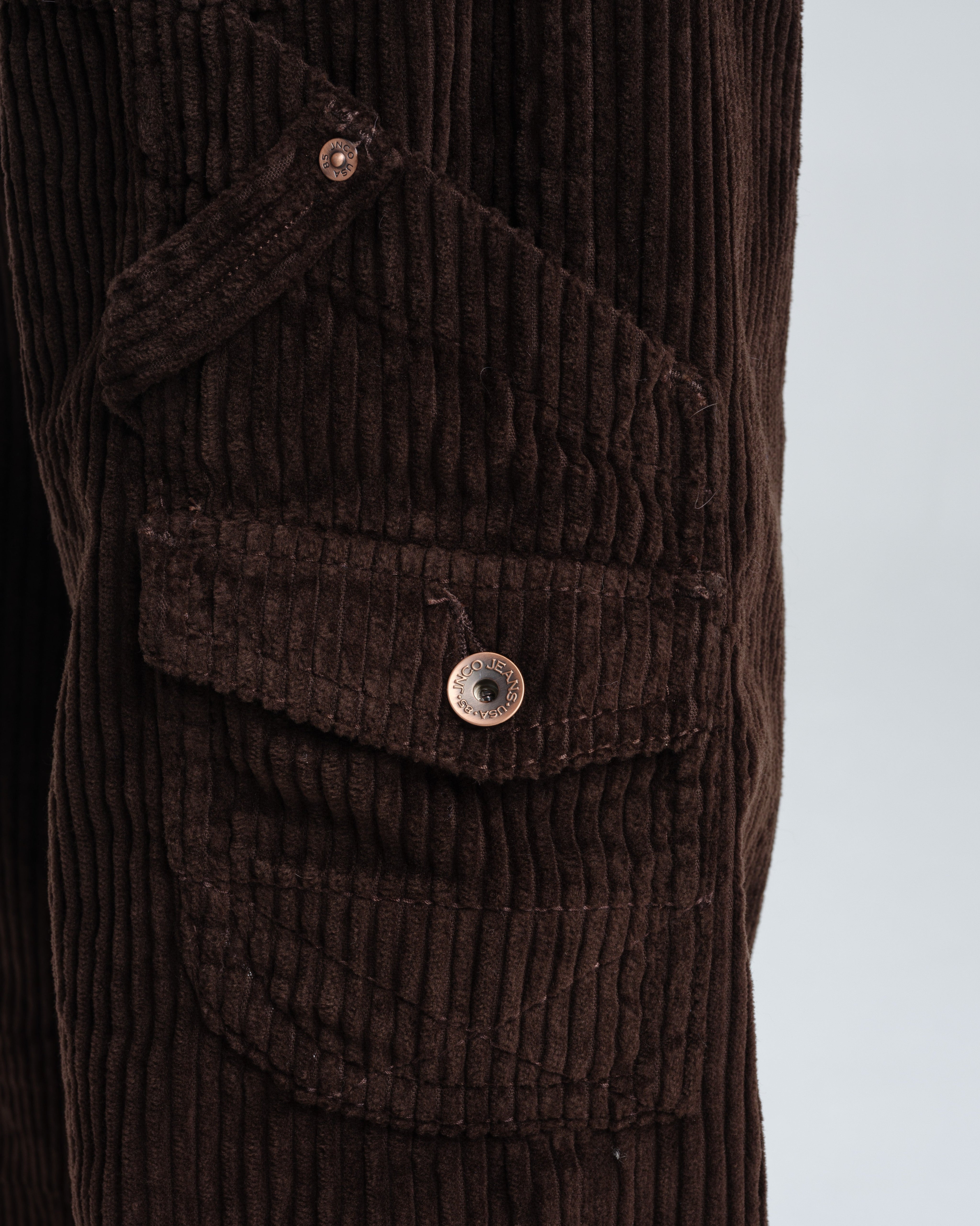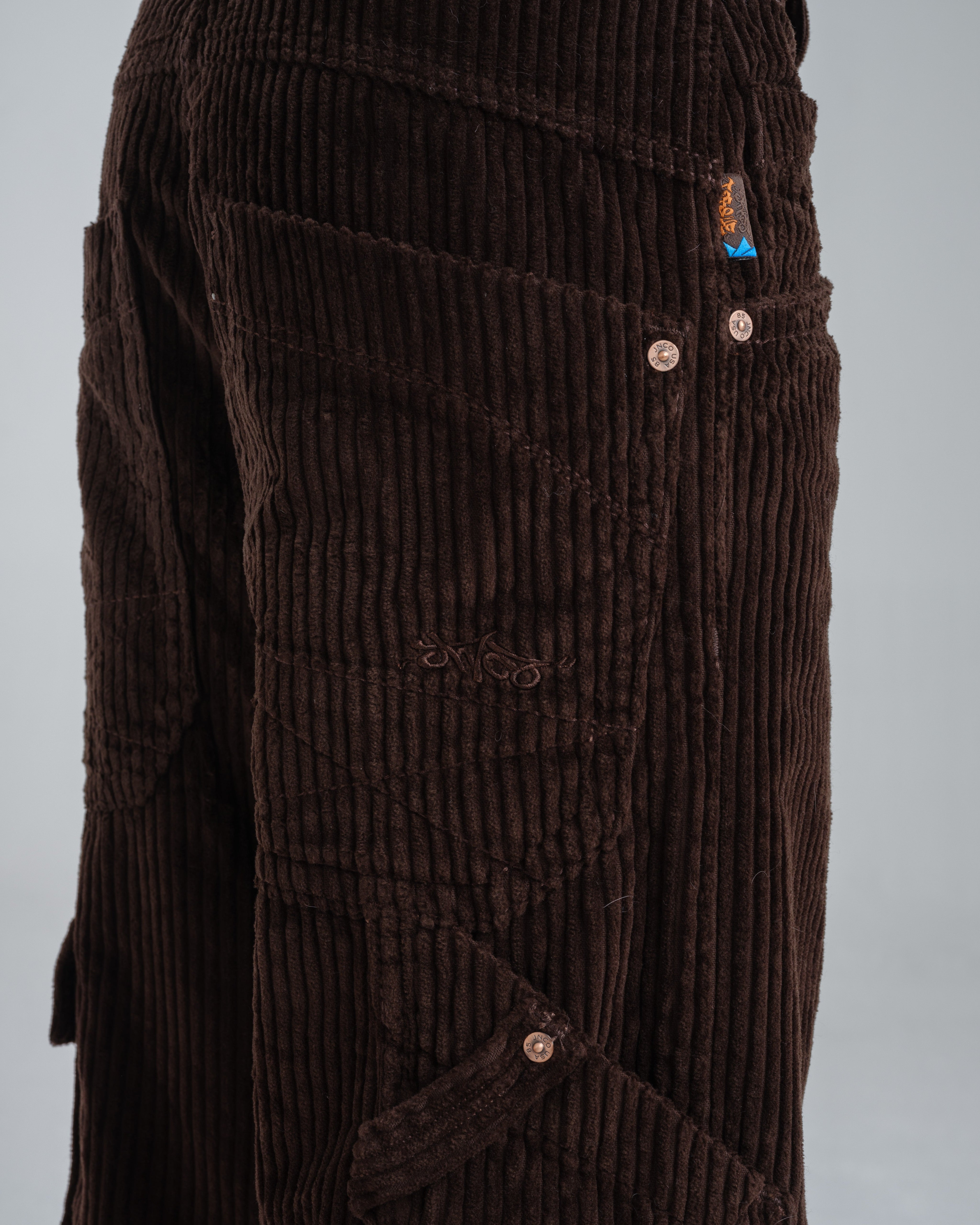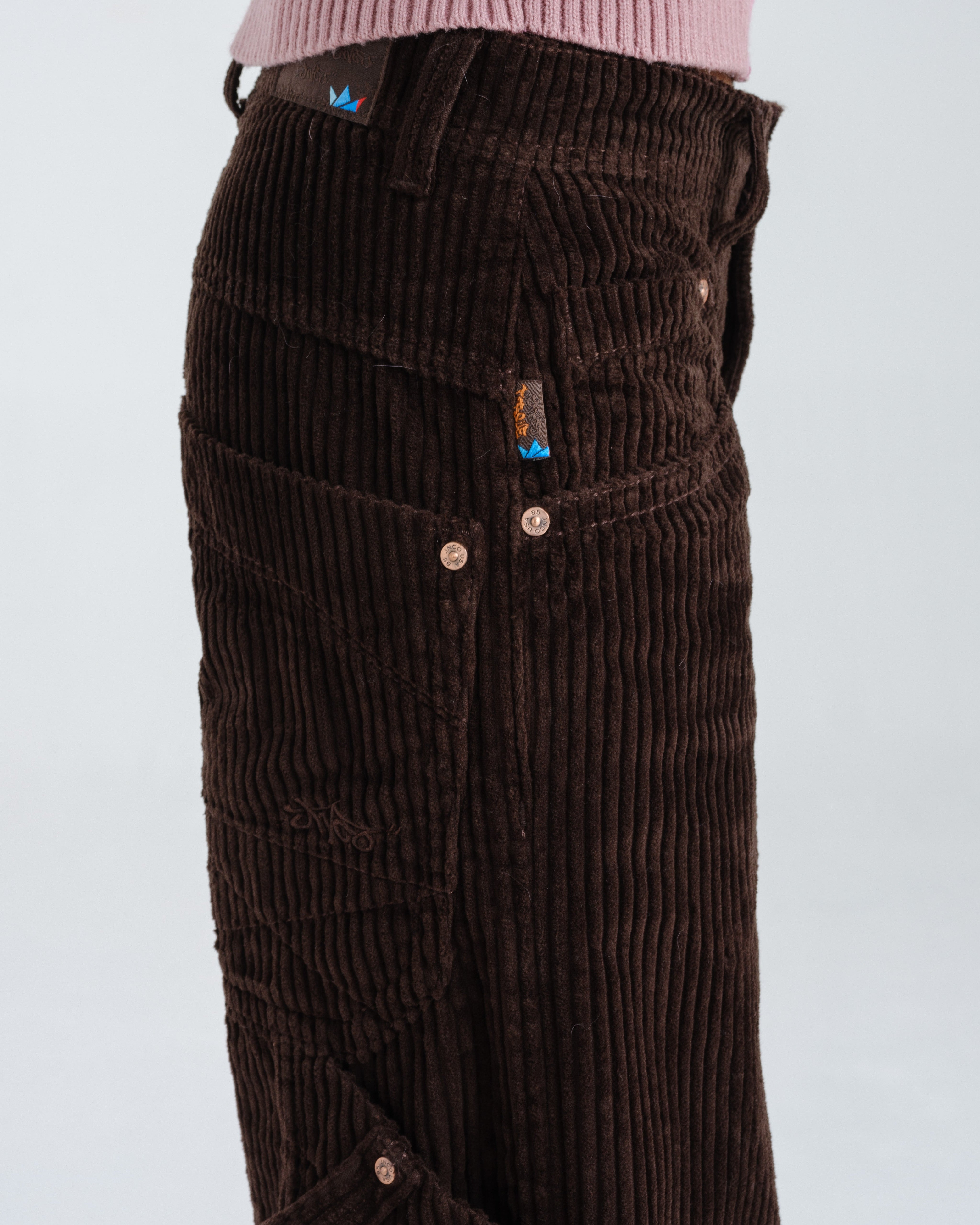 A modern twist on a classic workwear staple. 12oz 100% 4-Wale Corduroy in rich Java Brown. 23" stove-pipe bottom opening with a relaxed, wide-leg fit. Features a signature carpenter pocket and asymmetrical cargo pocket, and vintage-inspired details like angled front pockets, a hand-watch pocket, and oversized back patch pockets with mitered corners and “X” stitching. Finished with tonal stitching, reinforced utility belt loops, and premium hardware.
