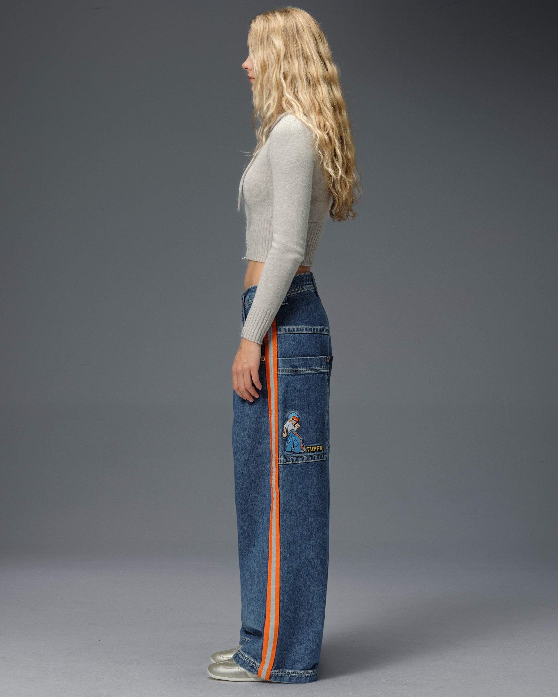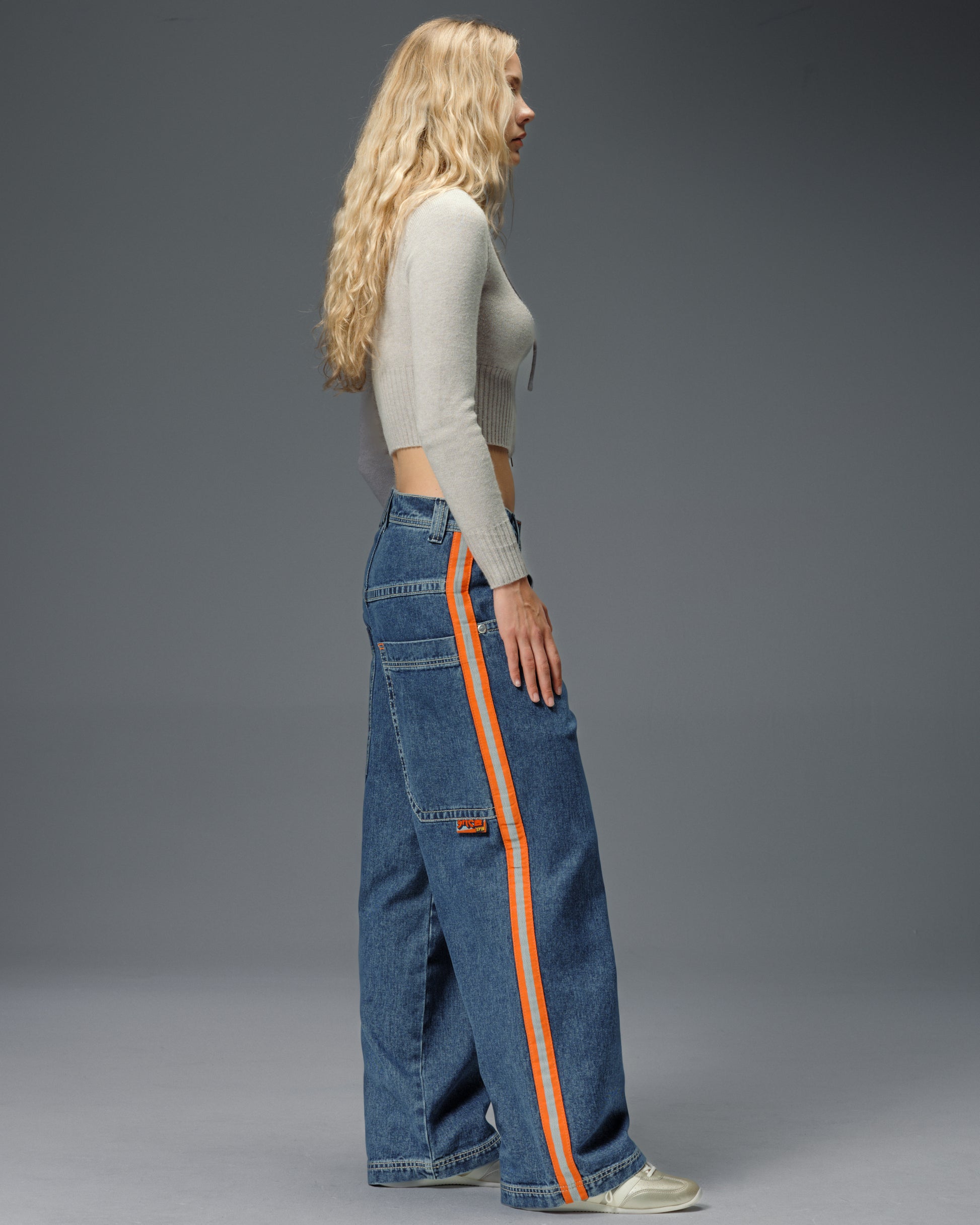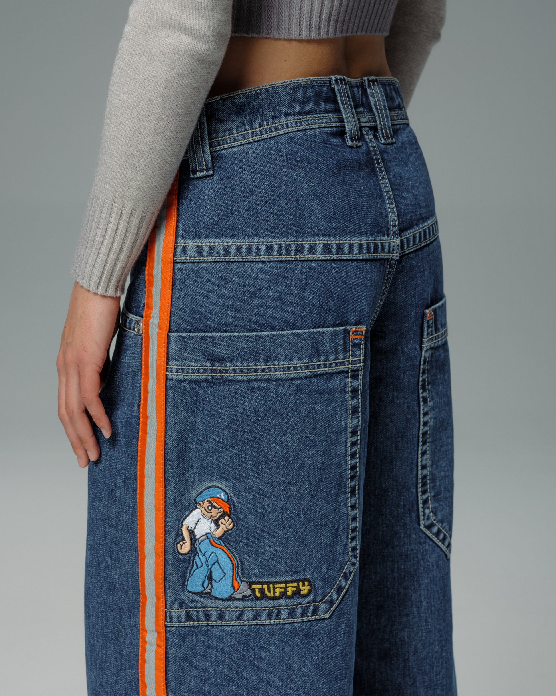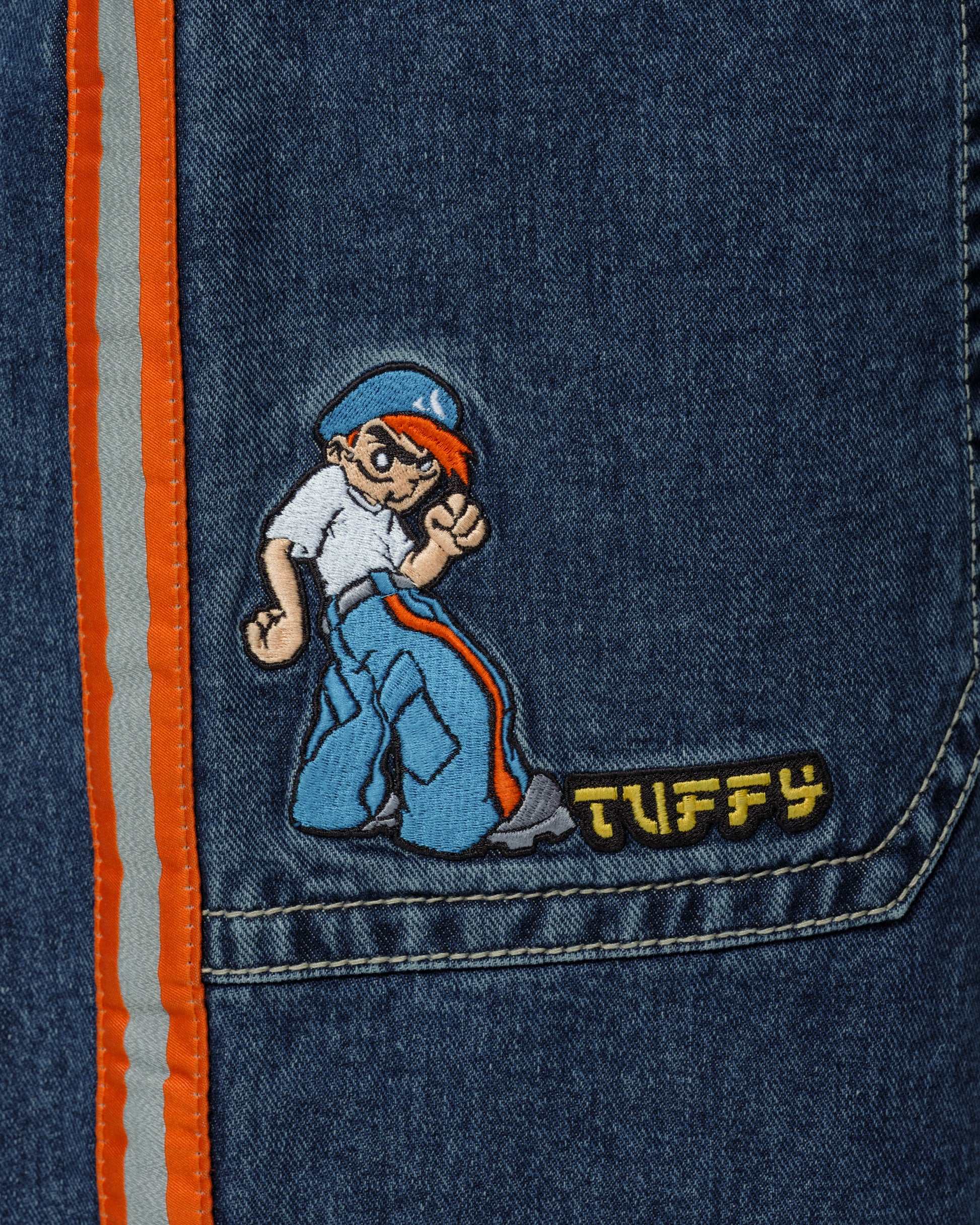 A true archival revival, the Tuffy stands as one of the most distinctive styles from JNCO’s late-’90s era of innovation. Featuring a 23" bottom opening and our signature Dark Stone denim wash, it’s developed for a naturally broken-in texture and effortless drape that deepens with wear. 14 oz. 100% cotton. 3x1 left hand weave. An underground favorite, the Tuffy stands apart with bright orange and reflective stripes, inspired by street-crew uniforms and highway-signage visibility. Every detail of this reissue honors the original: custom hardware, heavy contrast stitching, original Tuffy embroidery and woven labels, and the archival collectible flasher. Collector’s Edition. Limited quantities.