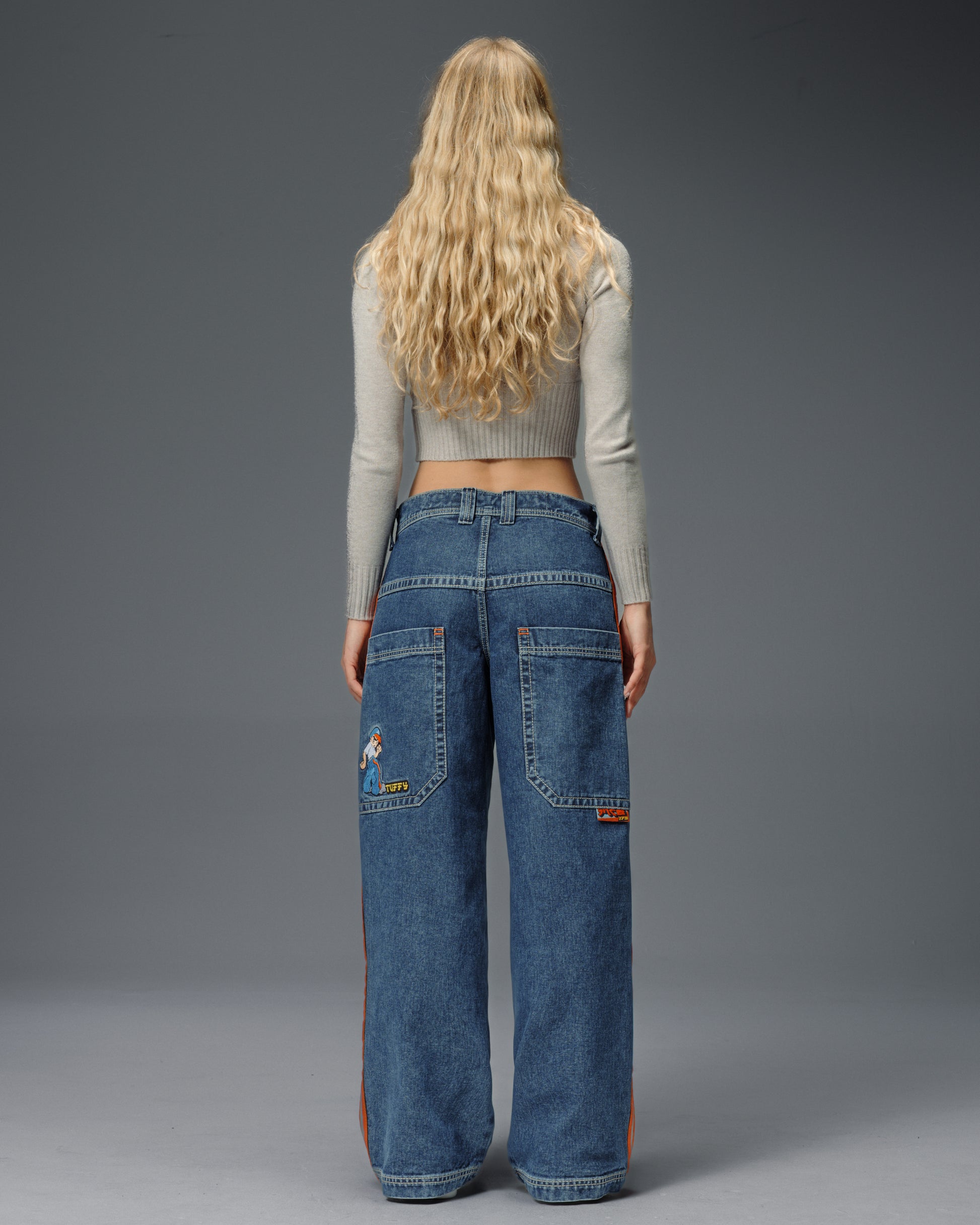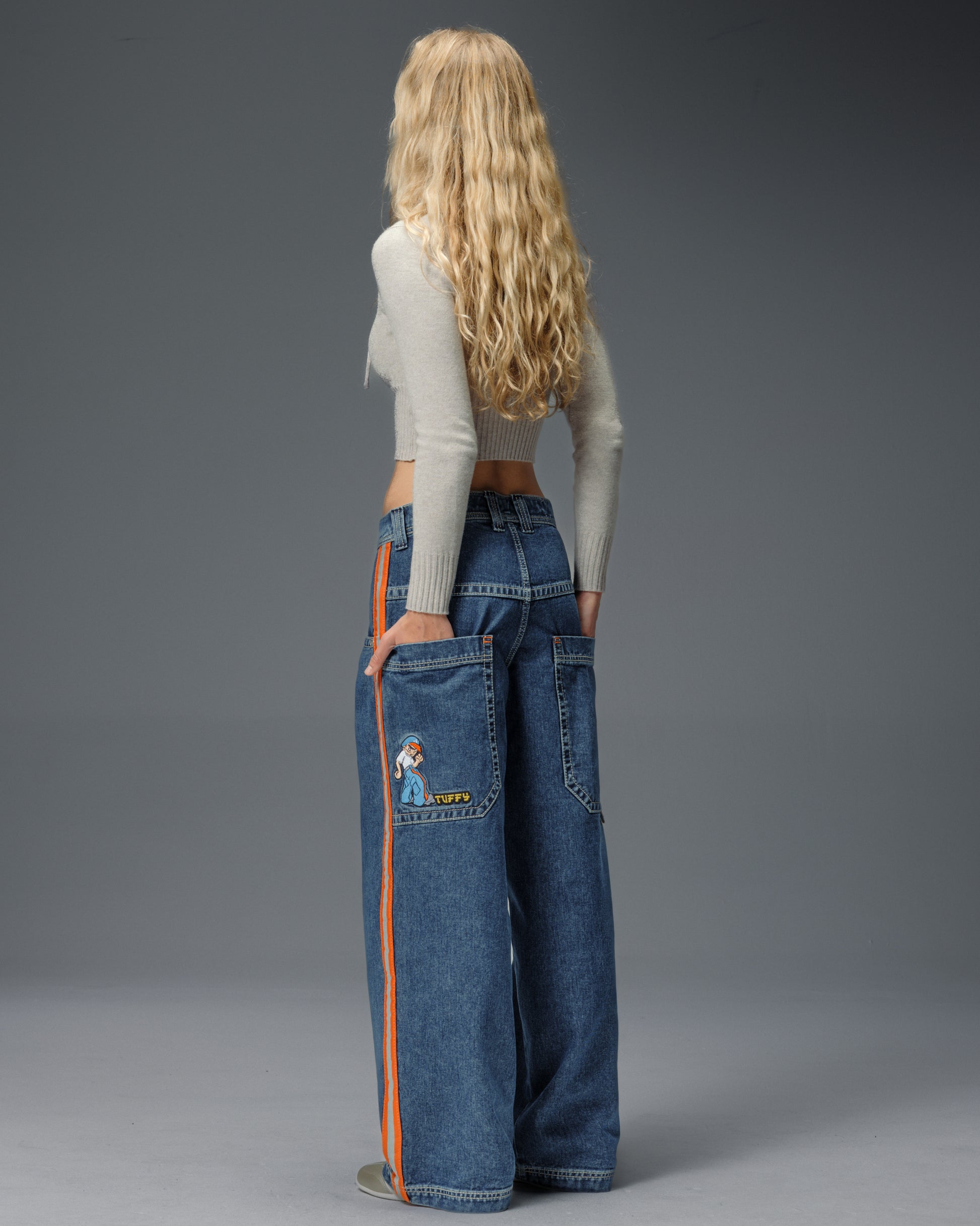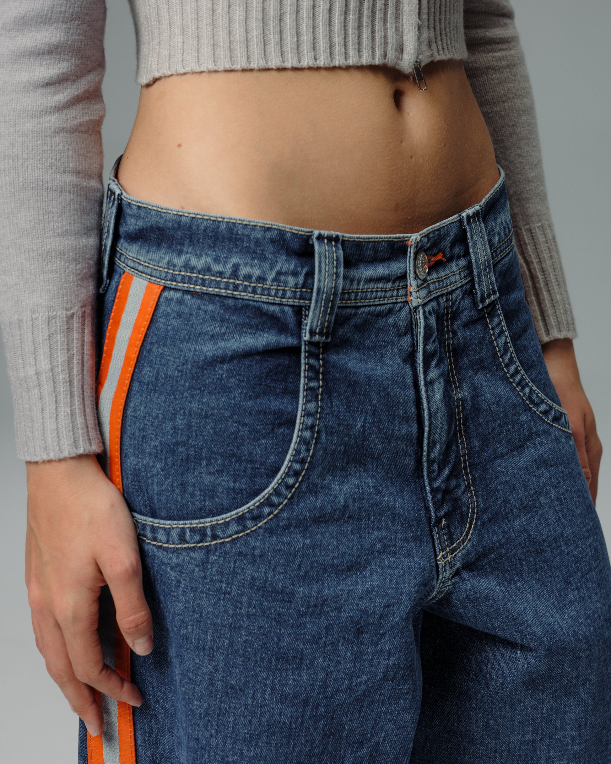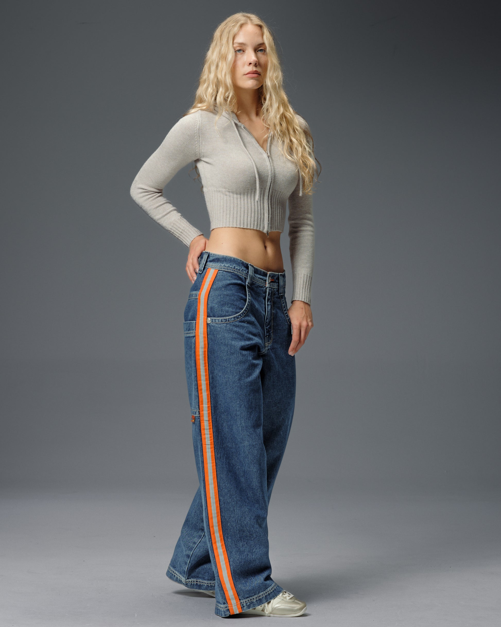 A true archival revival, the Tuffy stands as one of the most distinctive styles from JNCO’s late-’90s era of innovation. Featuring a 23" bottom opening and our signature Dark Stone denim wash, it’s developed for a naturally broken-in texture and effortless drape that deepens with wear. 14 oz. 100% cotton. 3x1 left hand weave. An underground favorite, the Tuffy stands apart with bright orange and reflective stripes, inspired by street-crew uniforms and highway-signage visibility. Every detail of this reissue honors the original: custom hardware, heavy contrast stitching, original Tuffy embroidery and woven labels, and the archival collectible flasher. Collector’s Edition. Limited quantities.