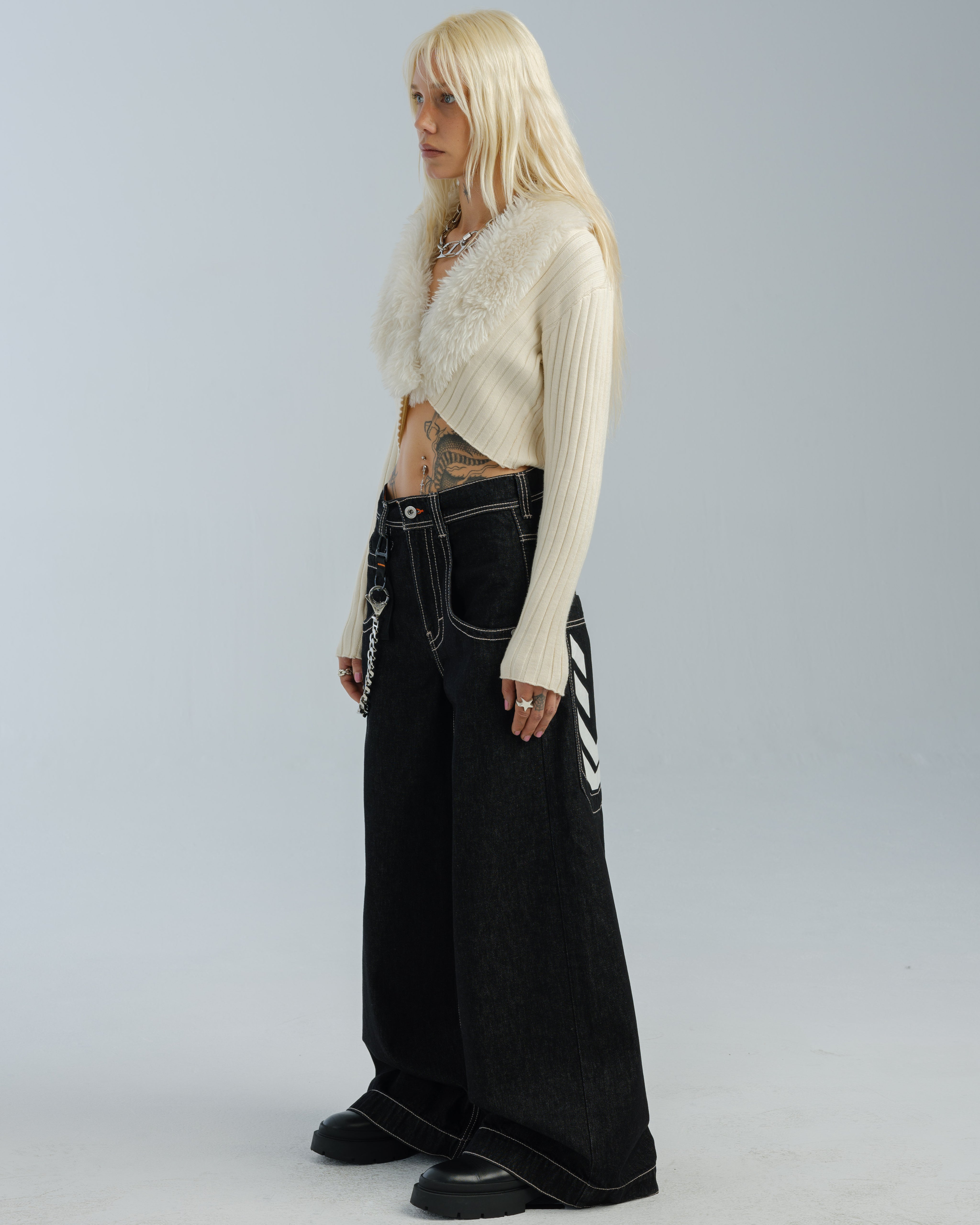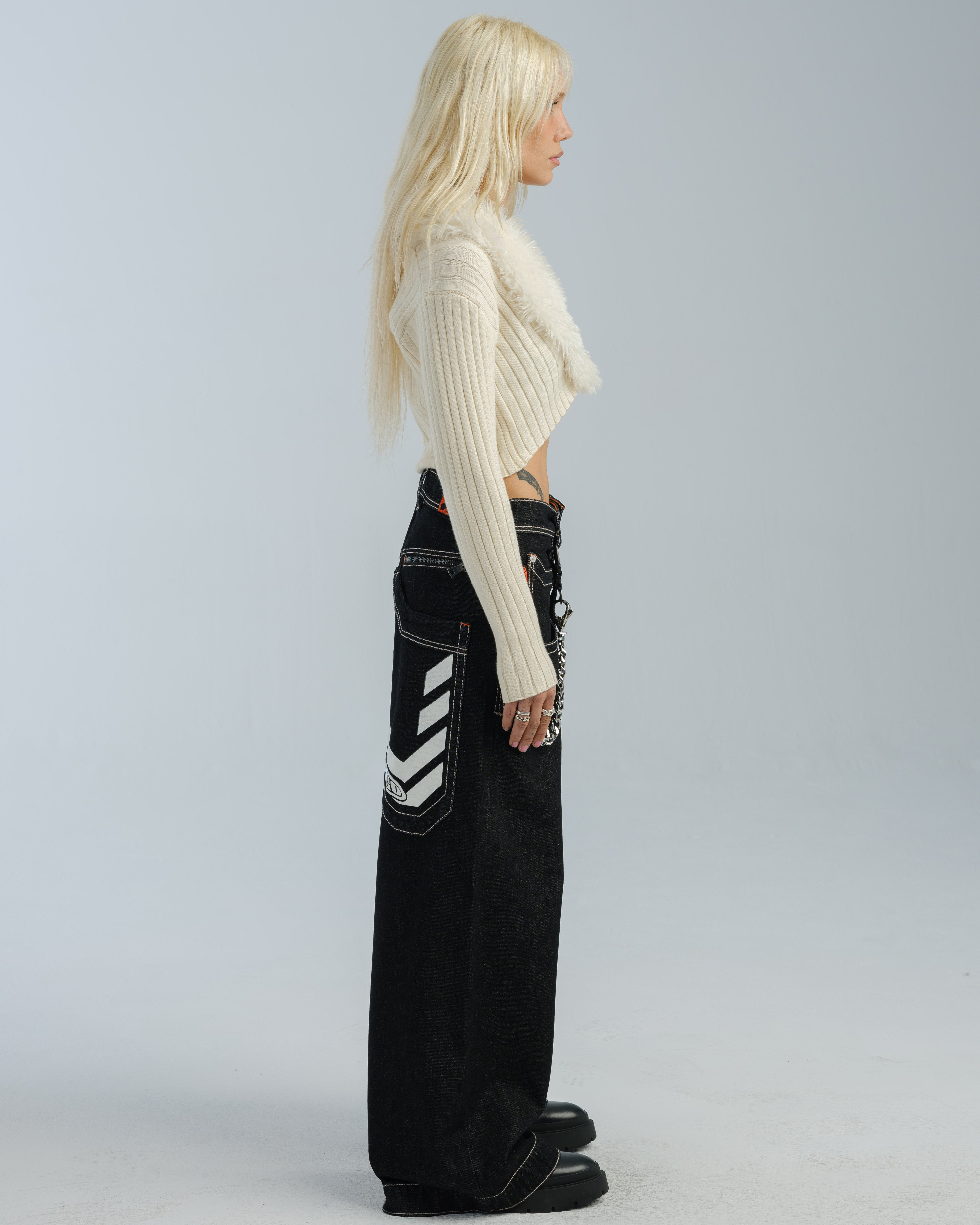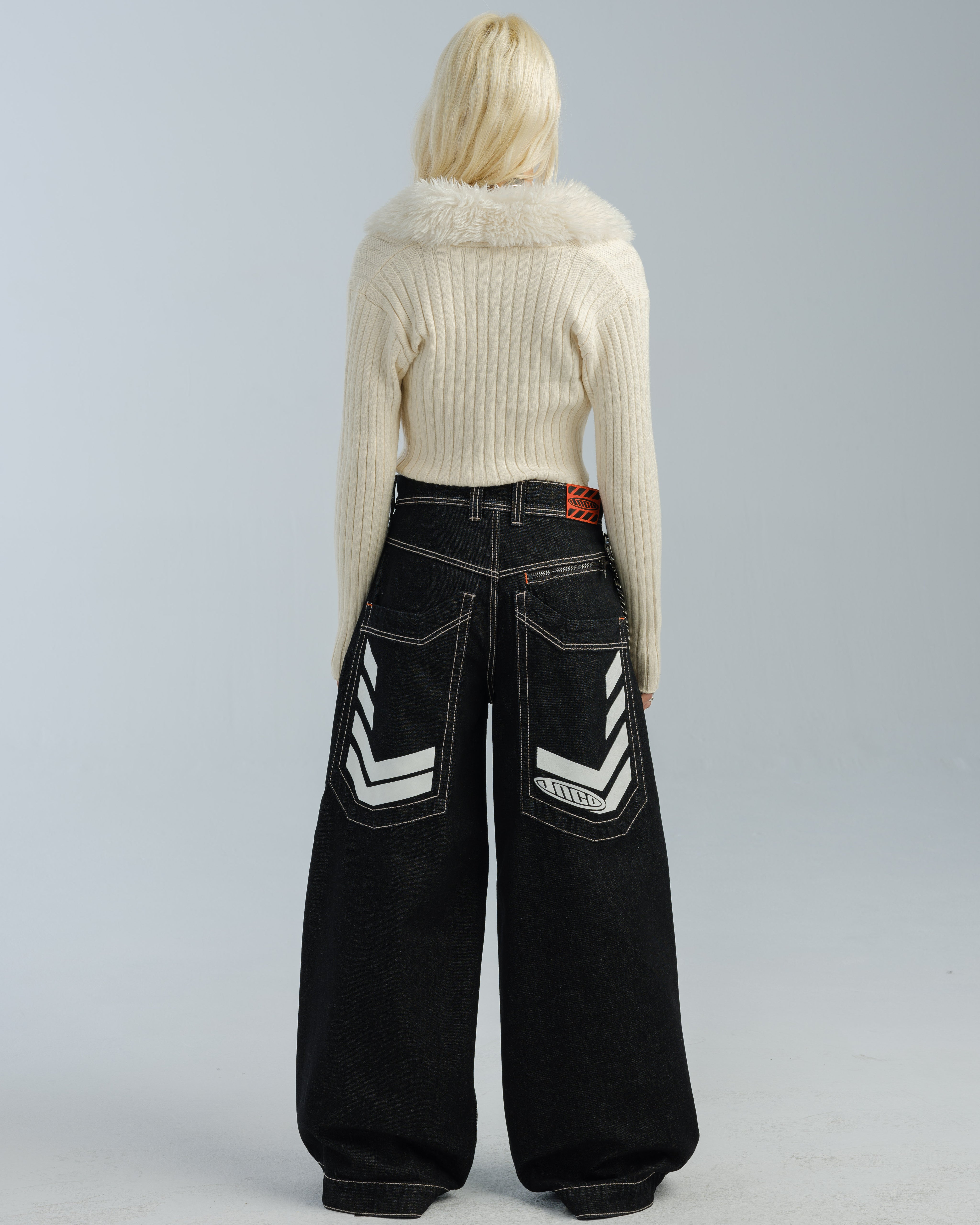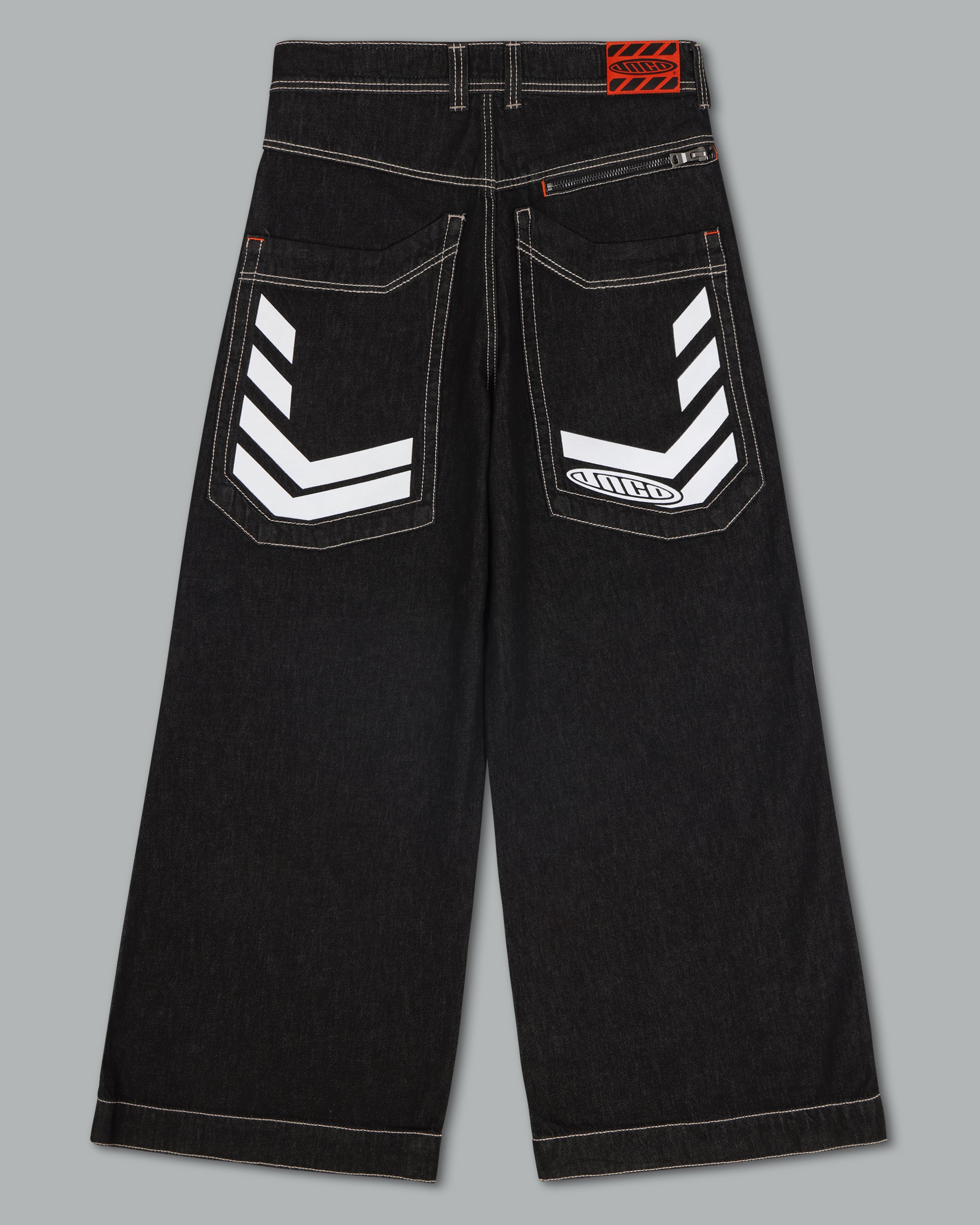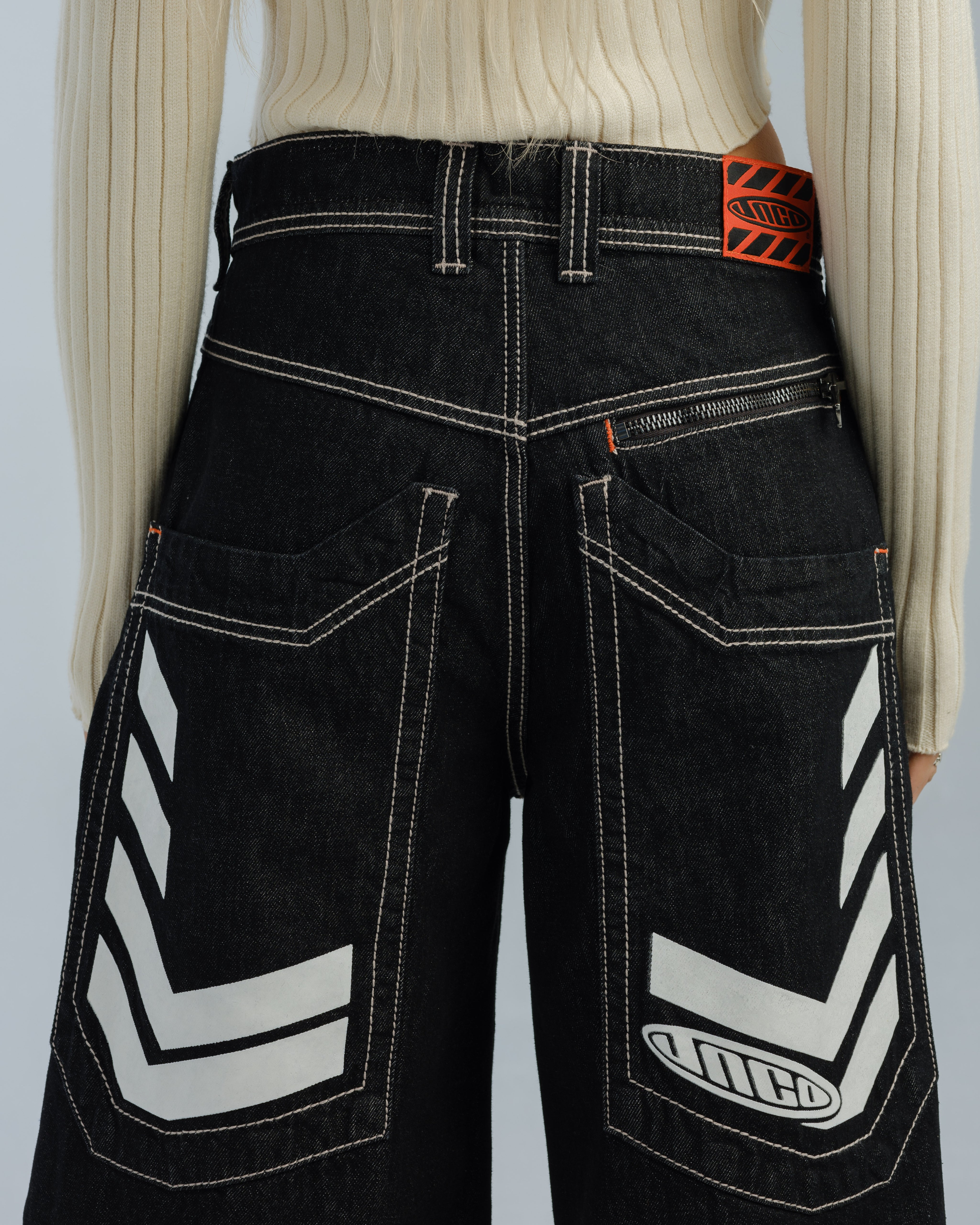 One-of-a-kind collector’s piece in Laser Black with White Warp. 30" bottom opening, 100% cotton rope-dyed denim with a luxe wax finish. Features glow-in-the-dark JNCO caution print on elongated back pocket—charge in sunlight to activate. Orange zipper and stitching, and back yoke zipper pocket. Includes extra-long collectible hangtag sticker. Old School Edition – Tested to Meet Needs.