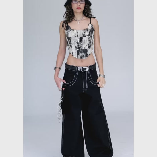A JNCO classic in Jet Black denim. 13oz 100% cotton rope-dyed with a luxe starch wax finish. 26" bottom opening with contrast stitching and wide double-stitched scoop and back pockets. Features original artwork, labels, and metallic swivel J embroidery on back pocket. Collectible flasher included.