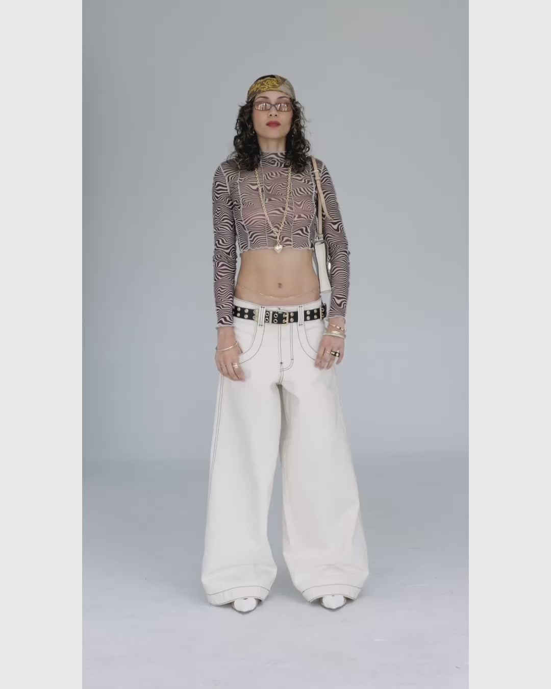 A JNCO classic in Natural Bull Denim Silicone Wash. 26" bottom opening with wide double-stitched scoop and back pockets. 13.5oz 100% cotton rope-dyed denim with a luxe starch wax finish. Includes original artwork, labels, and swivel J embroidery on back pocket. Collectible flasher included.