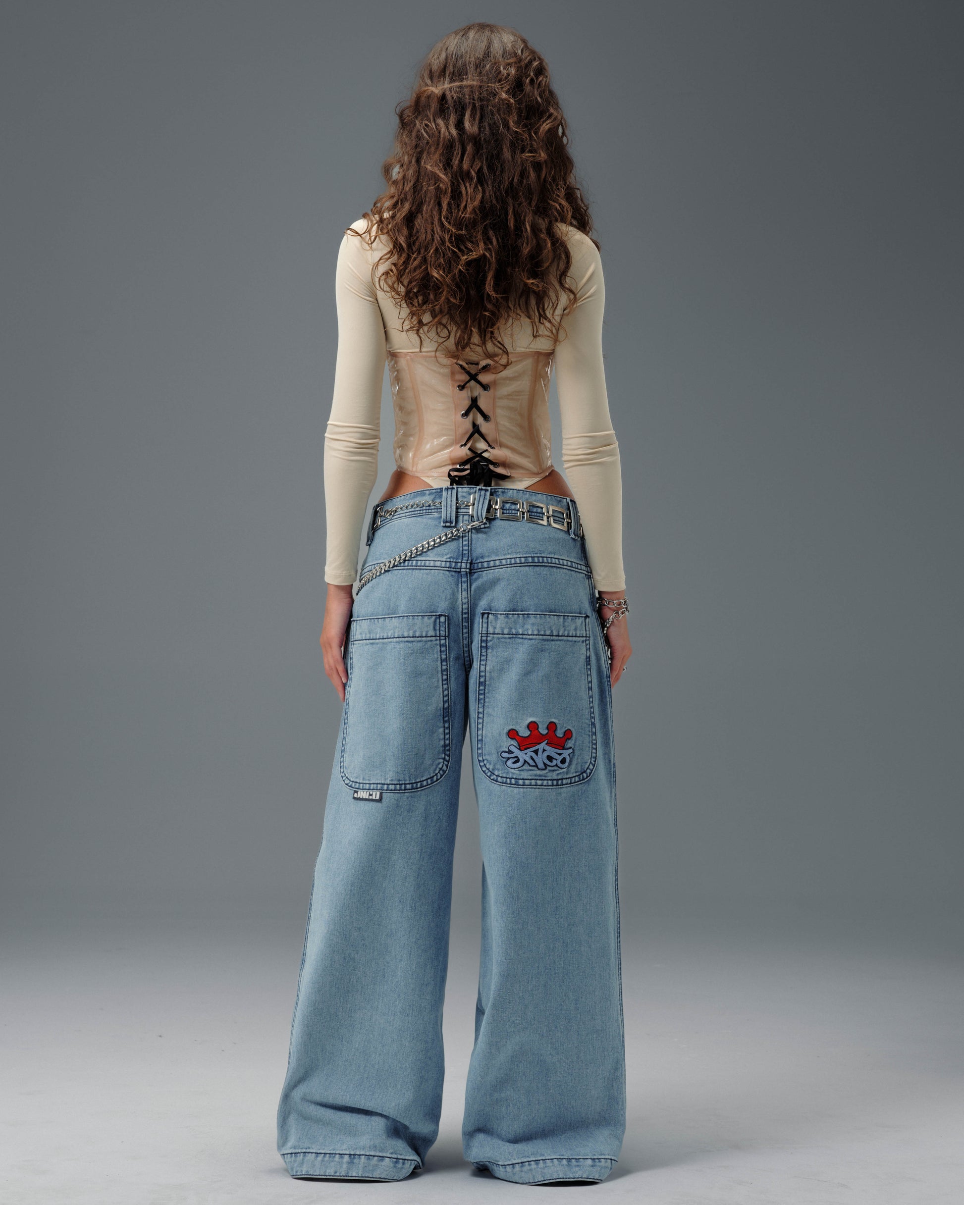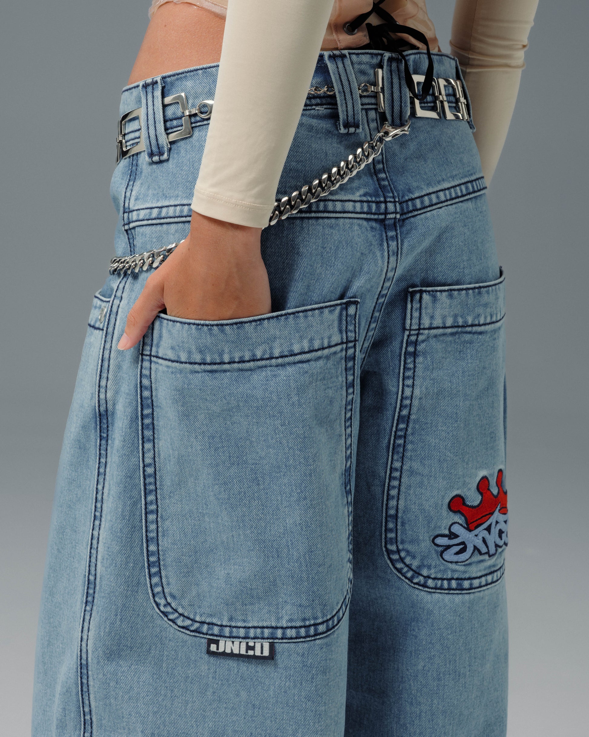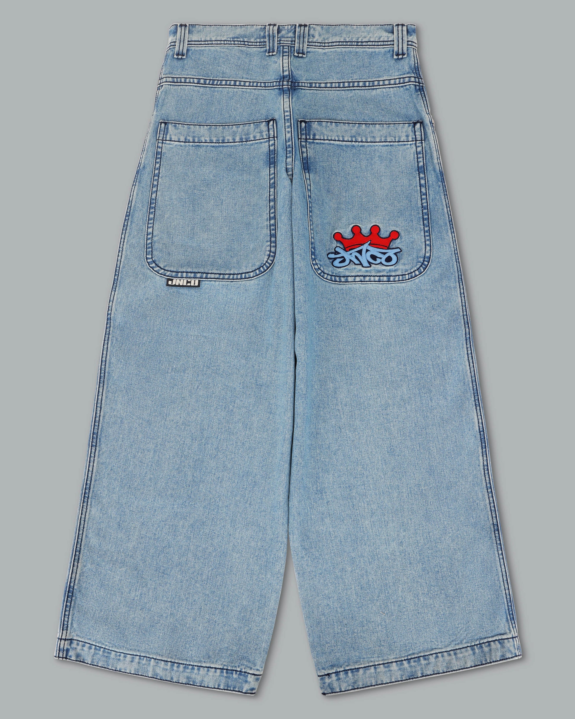 Features the iconic JNCO Crown logo embroidery, and new custom buttons and rivets.