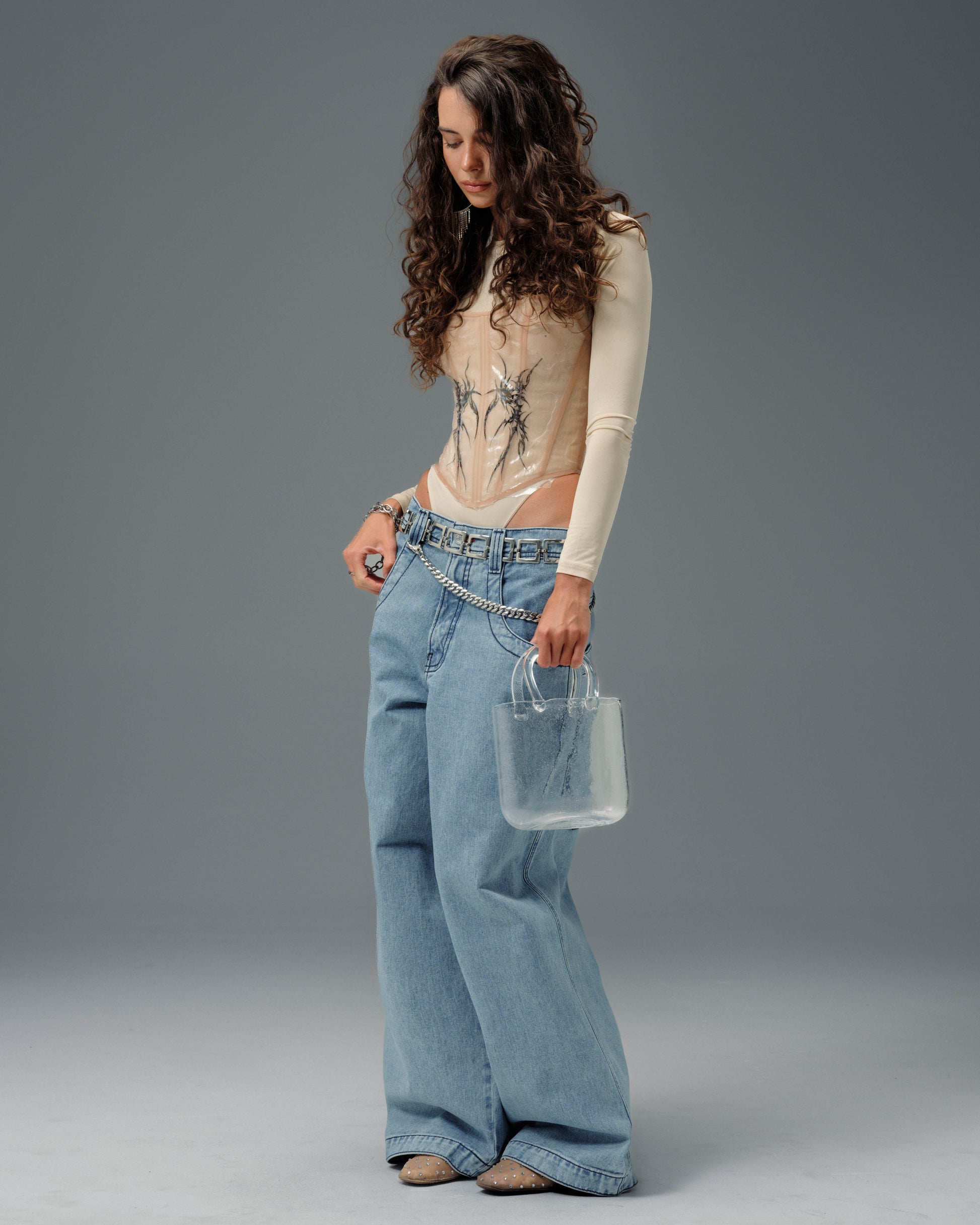 26" bottom opening with double chain stitch detailing on the waistband and hem.