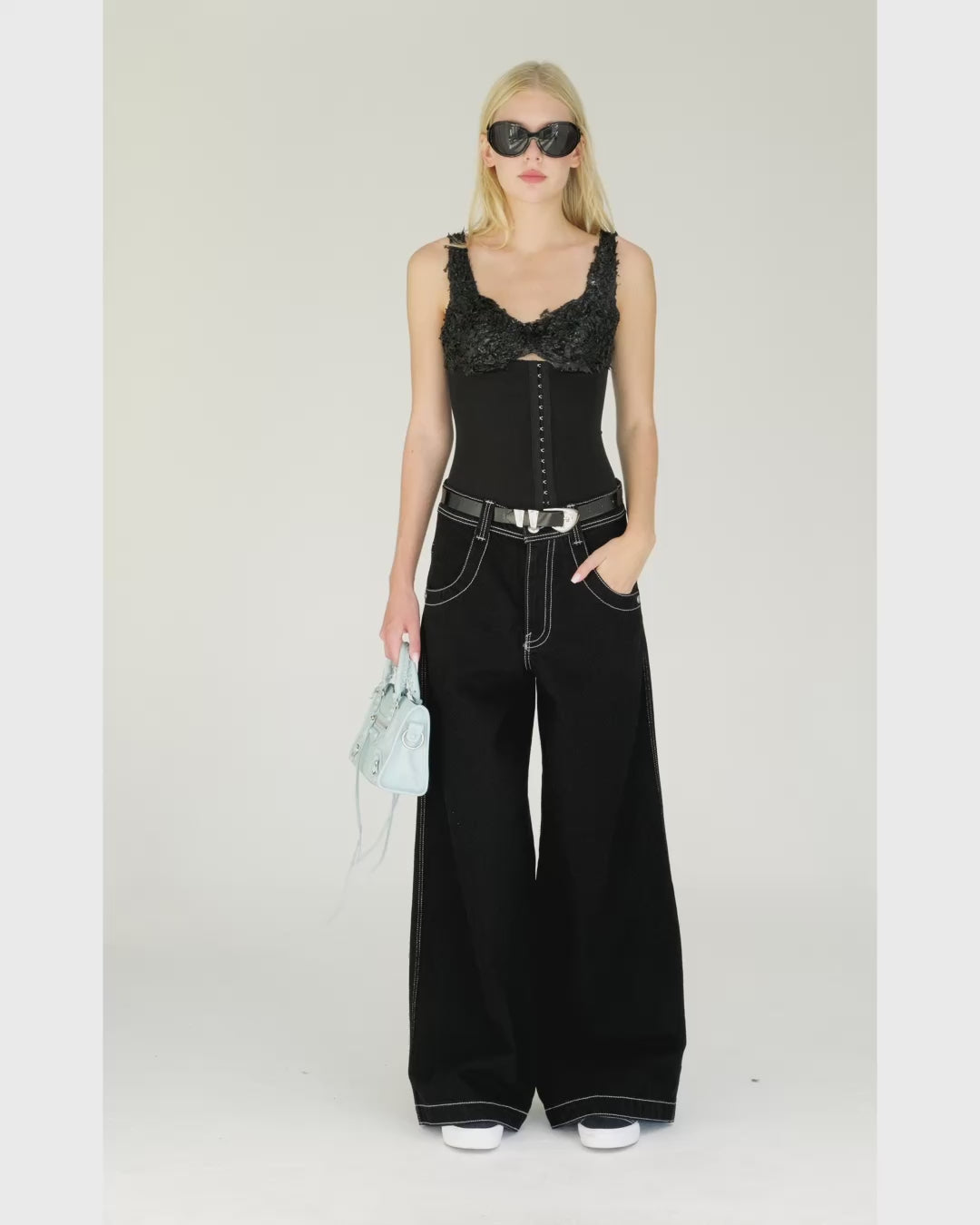 A revamped rendition of the original Twin Cannon, now elevated with bold new detailing. 13oz 100% cotton rope-dyed Jet Black denim, finished with a blended starch wax for a smooth, luxurious feel. 26" bottom opening with original contrast stitching and double chain stitch details at the waistband and hem. Features iconic JNCO Crown logo metallic embroidery, and new custom buttons and rivets. Collectible new edition flasher included.