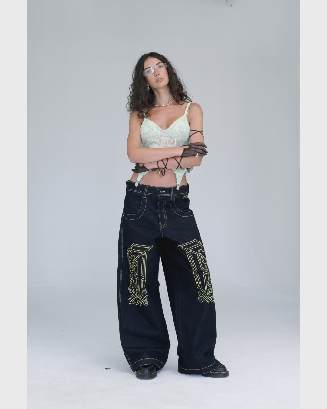 A fusion of JNCO’s Twin Cannons and Royals. Deep indigo with resin treatment, semi-rigid feel. 26" bottom opening with original contrast stitching. Features wide double topstitching, Royal embroidery patch (80,000 stitches), and exclusive “J” monogram (160,000 metallic gold stitches). Custom rivets and collectible flasher included.