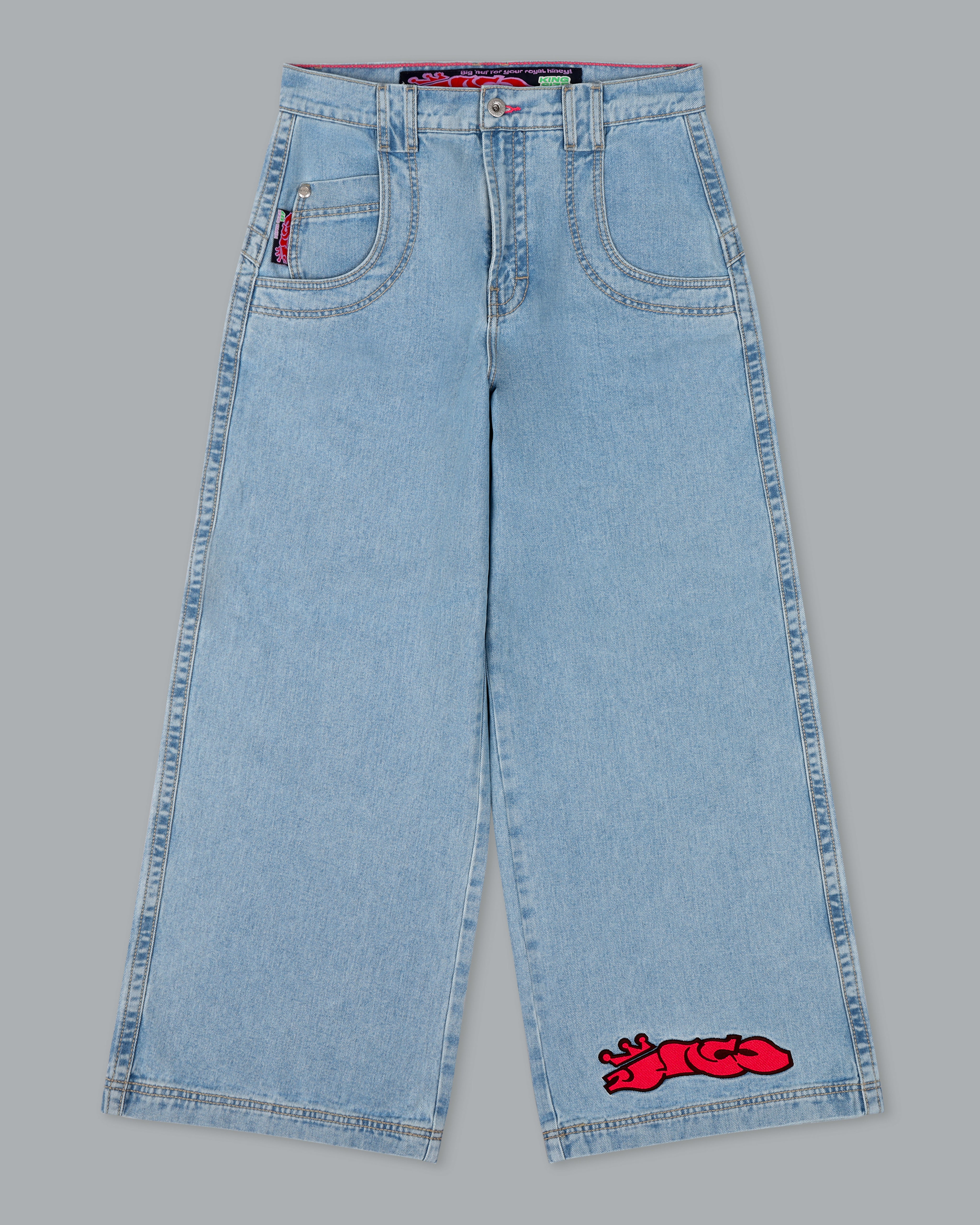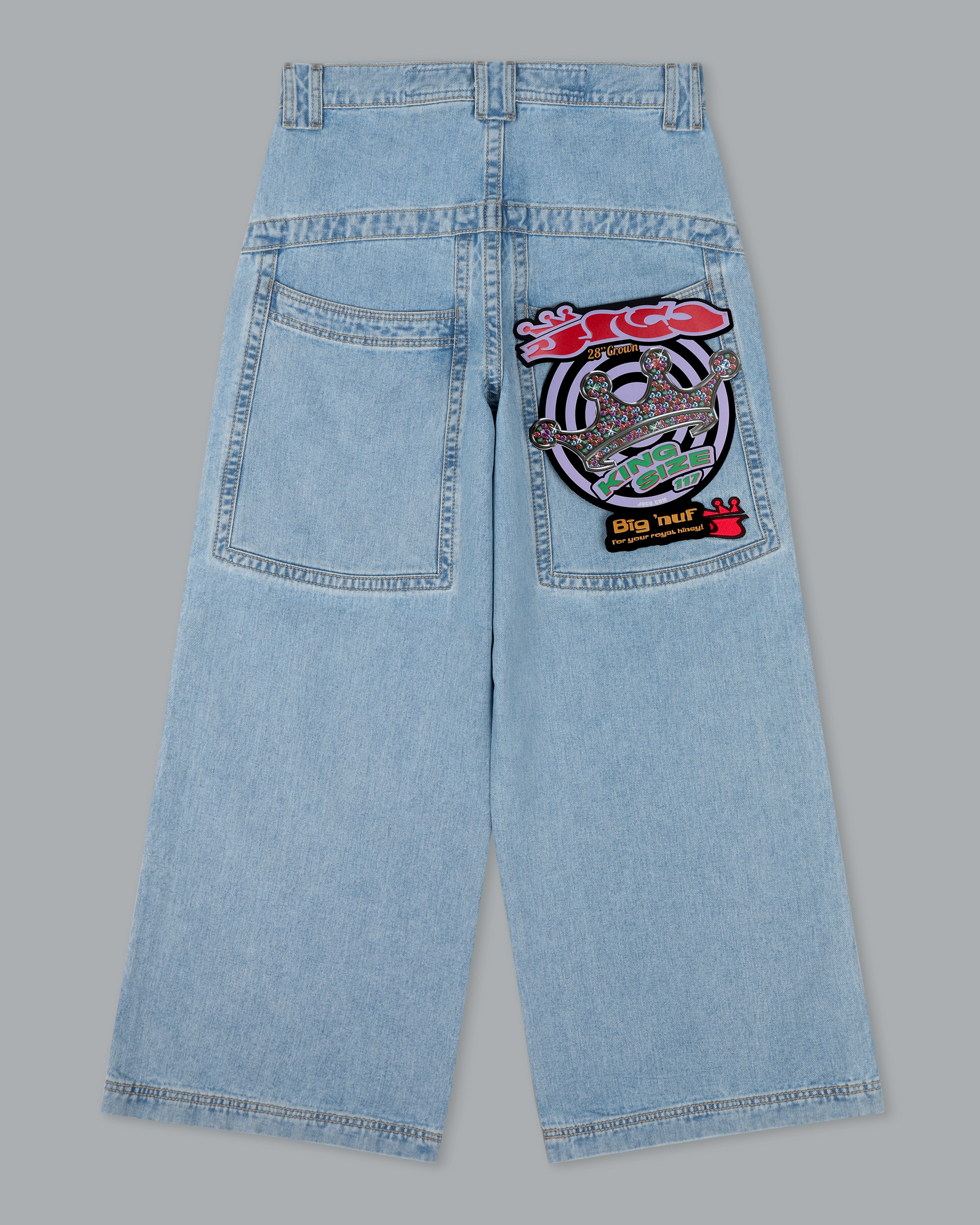 Classic 28" bottom opening in Original Vintage Wash. 14oz 100% cotton denim with heavy double contrast stitching. Features “Royal J” embroidery on back pocket and “Royal JNCO” on front leg. Includes collectible flasher. Limited Edition – limited stock.