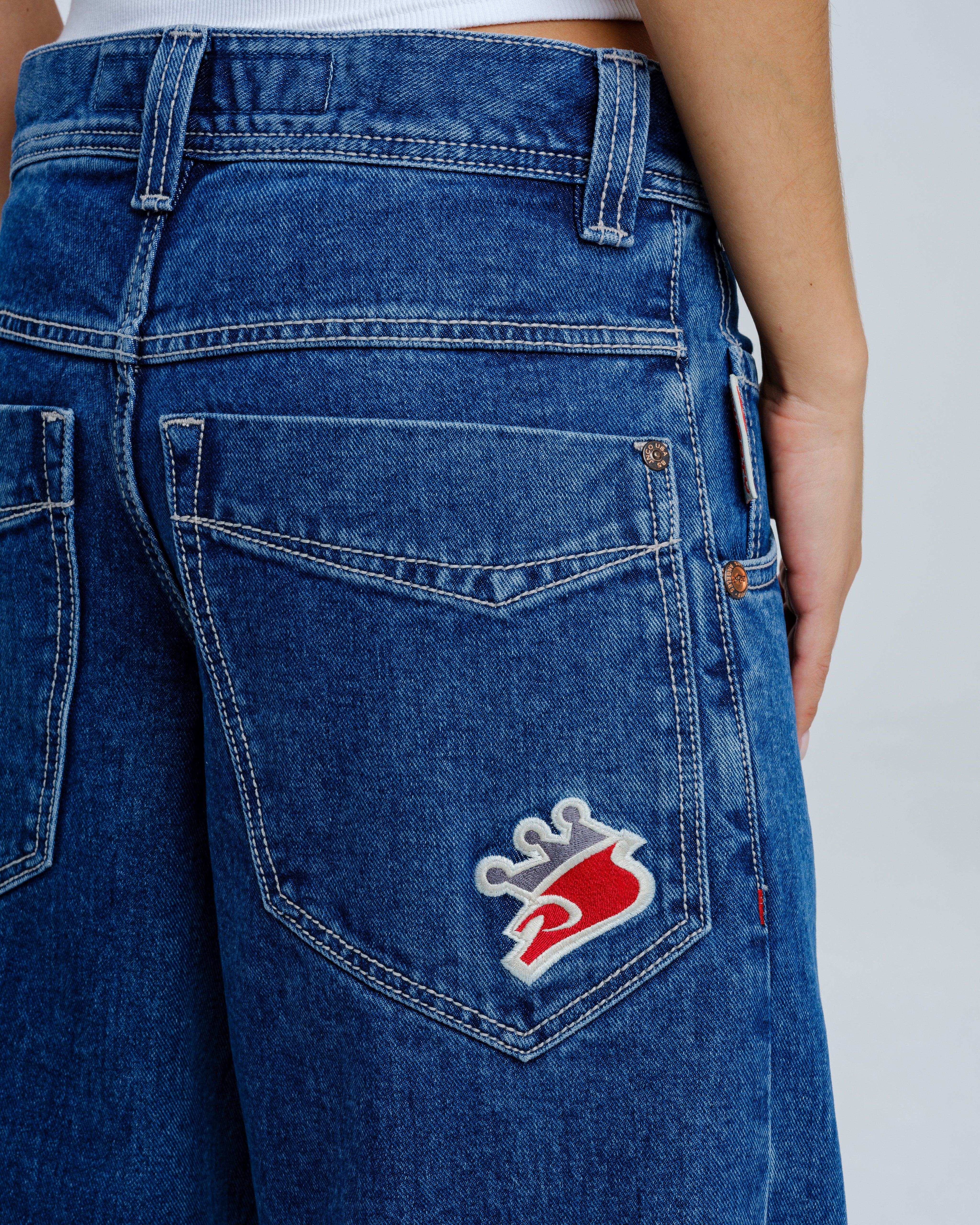 A reinvigorated take on the original Pipes in a classic Dark Stone Wash. 14oz 100% cotton denim with a 3x1 left-hand weave and contrast stitching. 23" bottom opening with angular pockets and double chain stitch details at the waistband and hem. Features the new Easy Wide Pipes “JNCO J” embroidery, custom buttons and rivets, and a collectible new edition flasher.