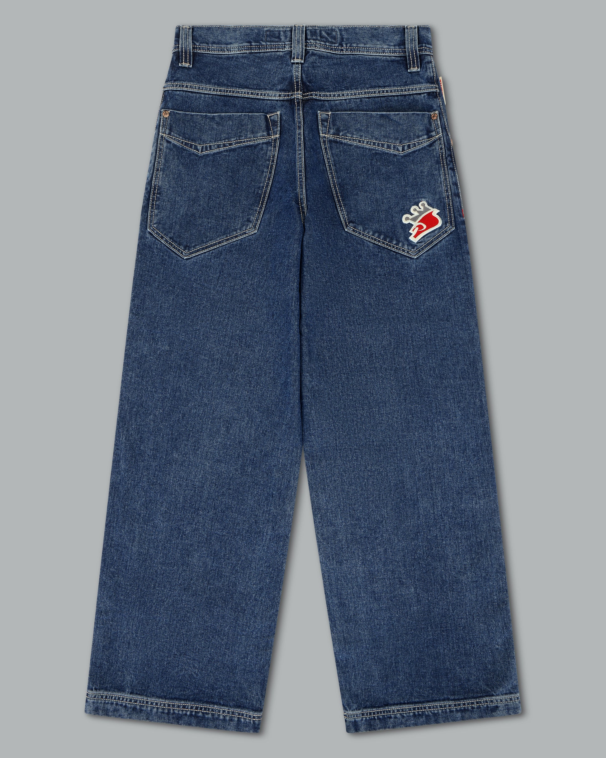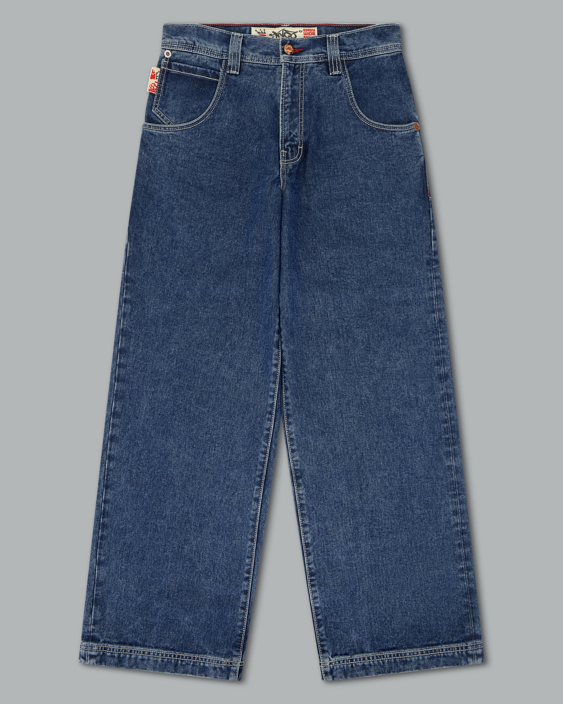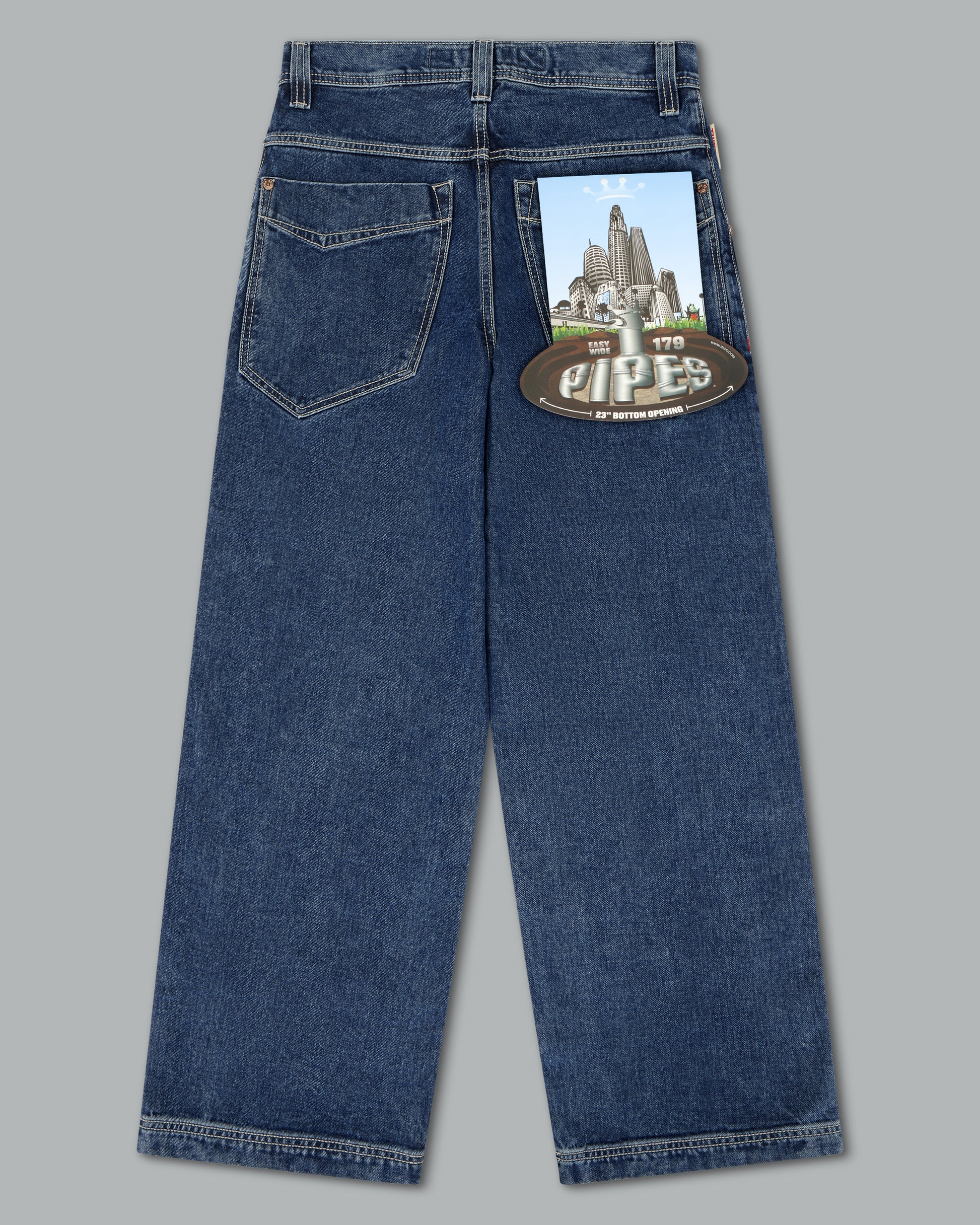 A reinvigorated take on the original Pipes in a classic Dark Stone Wash. 14oz 100% cotton denim with a 3x1 left-hand weave and contrast stitching. 23" bottom opening with angular pockets and double chain stitch details at the waistband and hem. Features the new Easy Wide Pipes “JNCO J” embroidery, custom buttons and rivets, and a collectible new edition flasher.