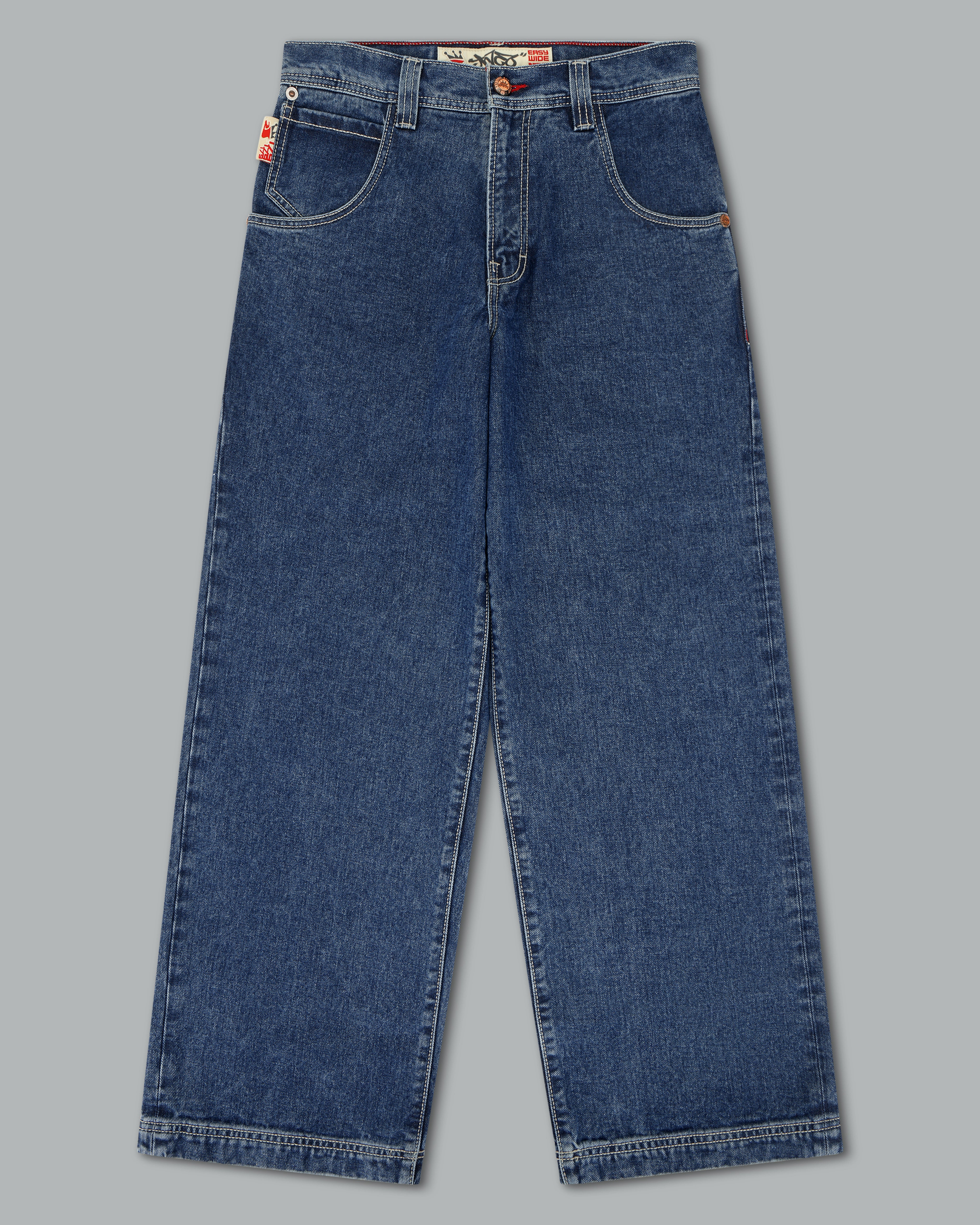 A reinvigorated take on the original Pipes in a classic Dark Stone Wash. 14oz 100% cotton denim with a 3x1 left-hand weave and contrast stitching. 23" bottom opening with angular pockets and double chain stitch details at the waistband and hem. Features the new Easy Wide Pipes “JNCO J” embroidery, custom buttons and rivets, and a collectible new edition flasher.