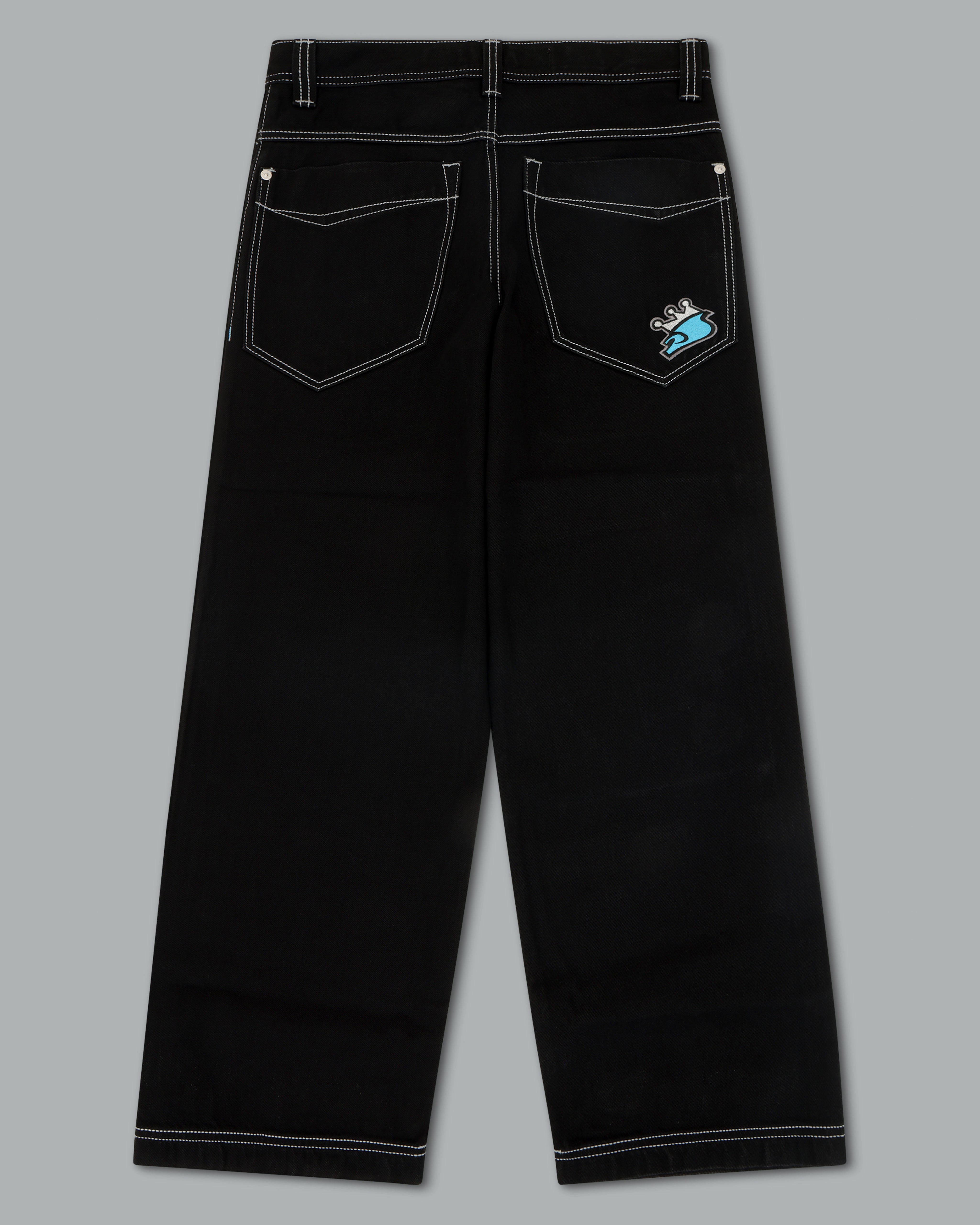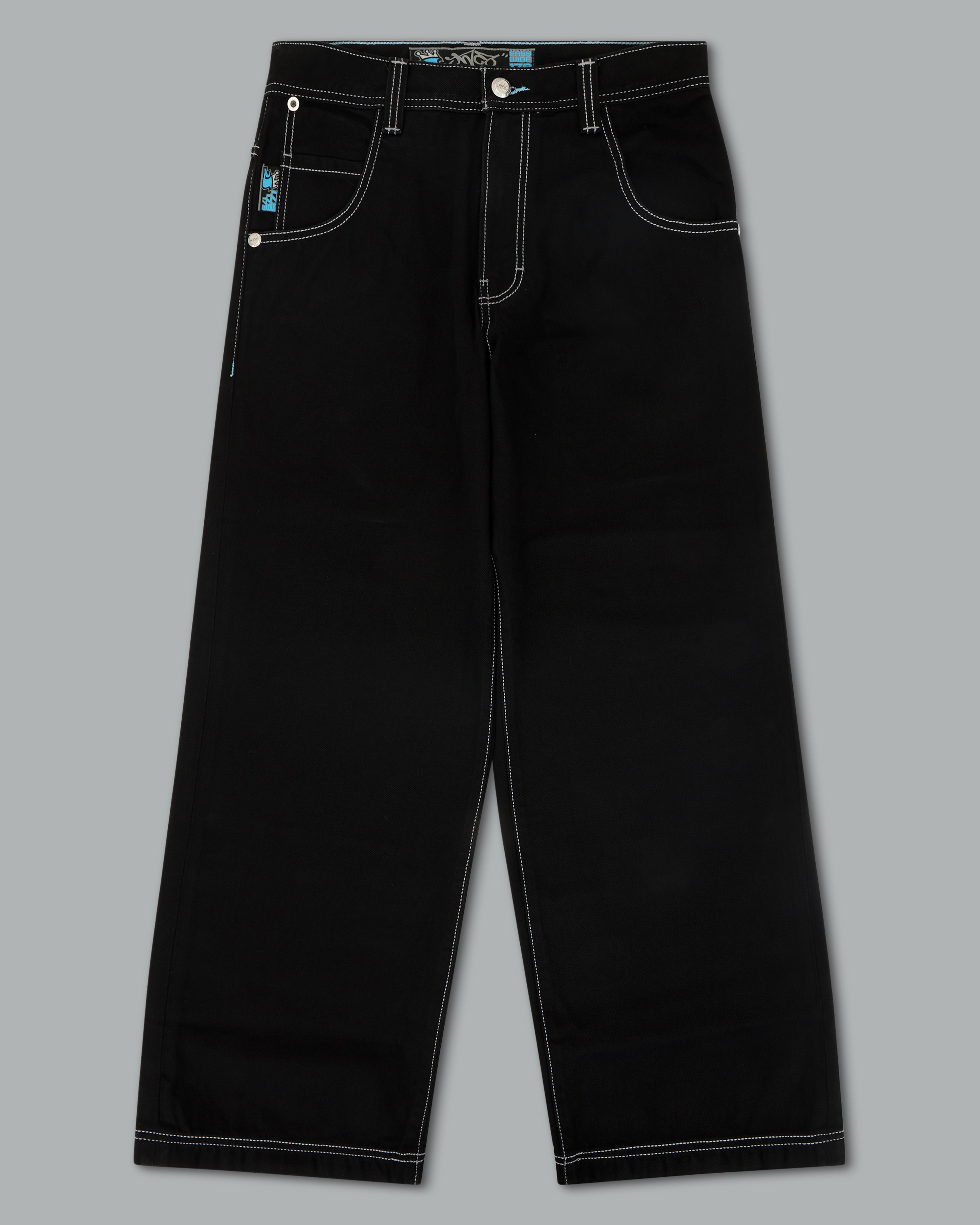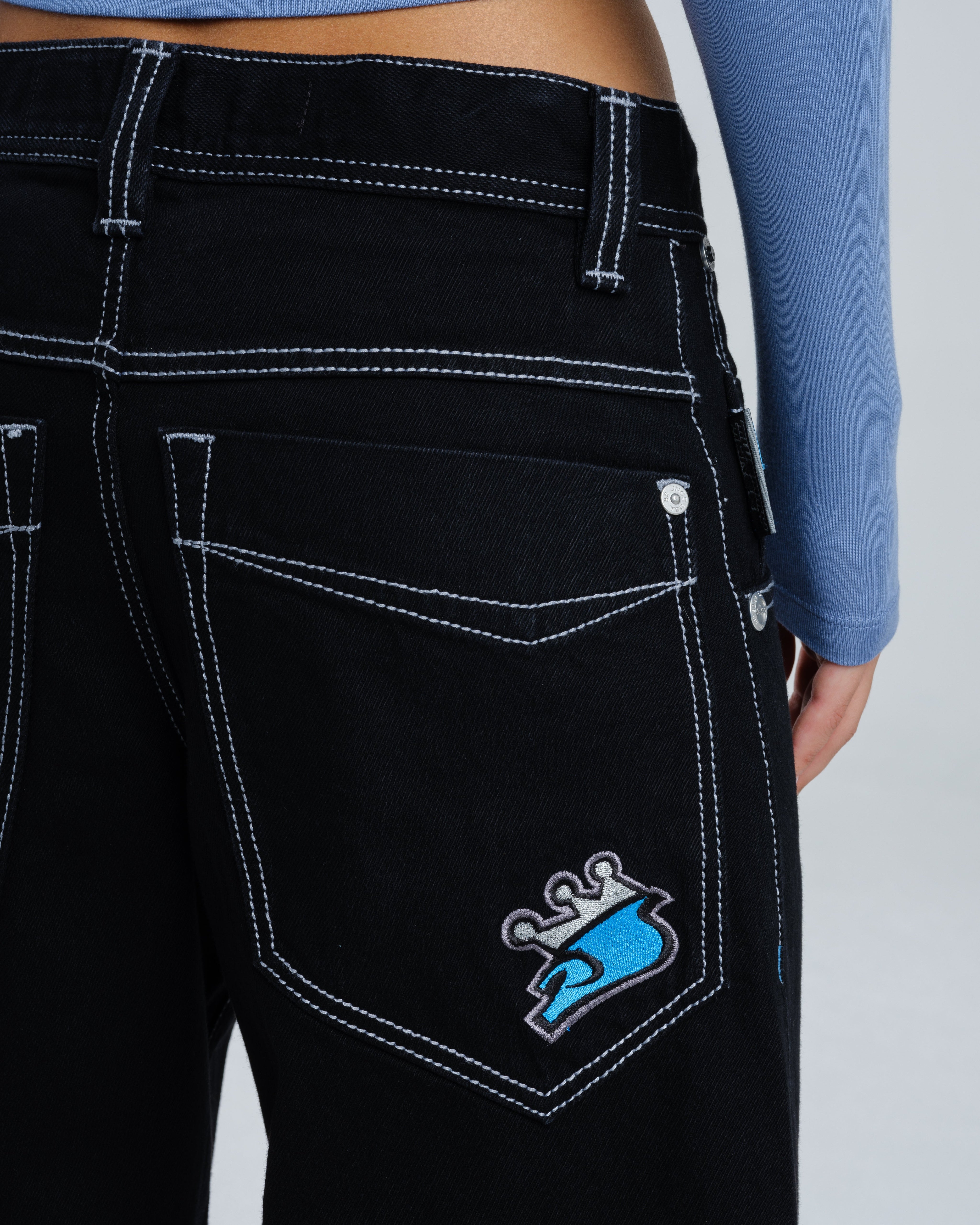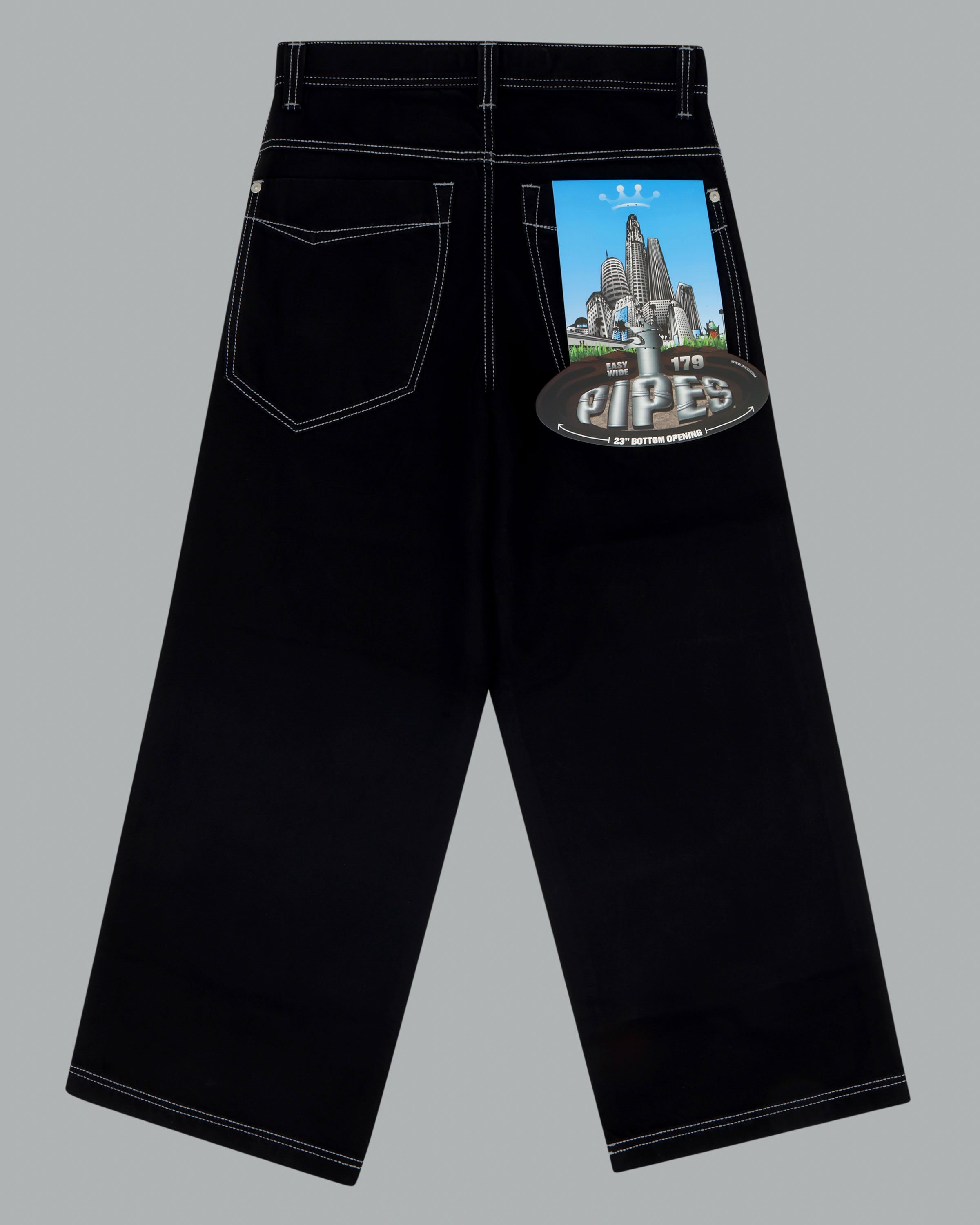 A reinvigorated version of the original Pipes, crafted in luxurious Jet Black denim. 13oz 100% cotton rope-dyed denim, finished with a blended starch wax for a smooth, refined feel. 23" bottom opening with contrast stitching and angular pockets. Features the new Easy Wide Pipes “JNCO J” embroidery, double chain stitch detailing on the waistband and hem, and custom buttons and rivets. Collectible new edition flasher included.