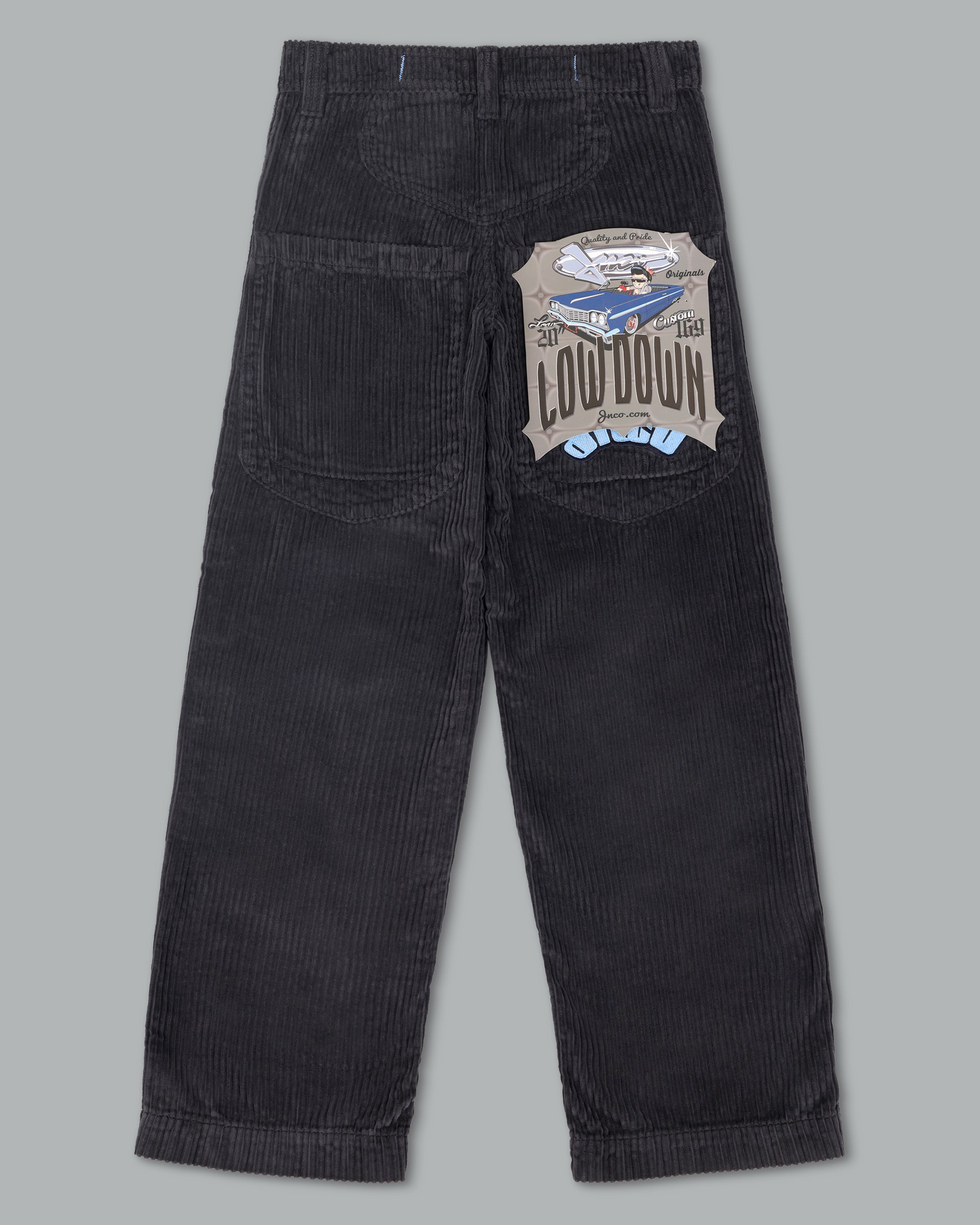 JNCO classic in heavy 4-Wale corduroy in magnet. 20" bottom opening, 12oz 100% cotton, soft finish. Heavy double stitching, original artwork, labels, and back pocket embroidery. Collectible flasher included.