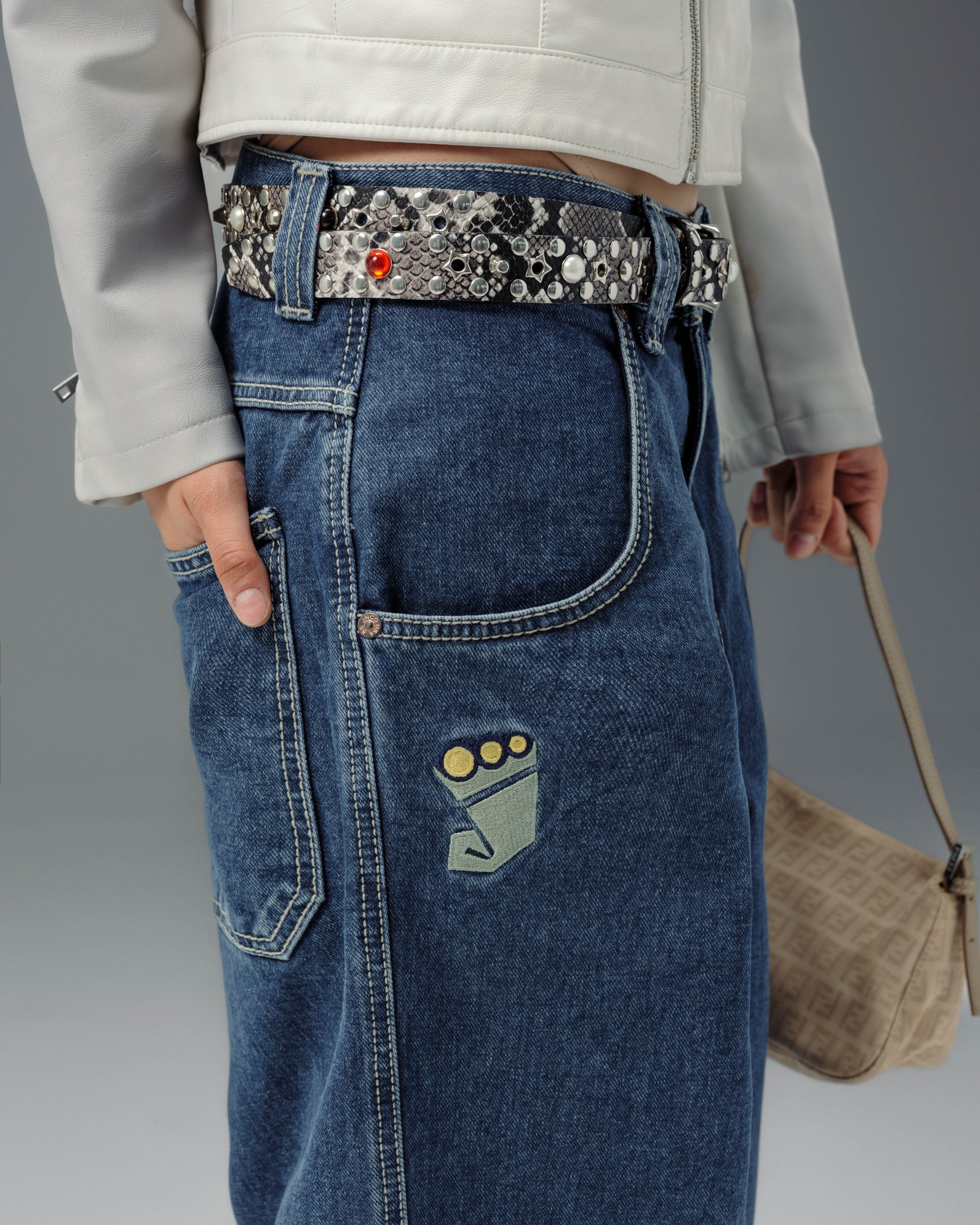 23" bottom opening with original artwork, labels, and front right pocket embroidery.