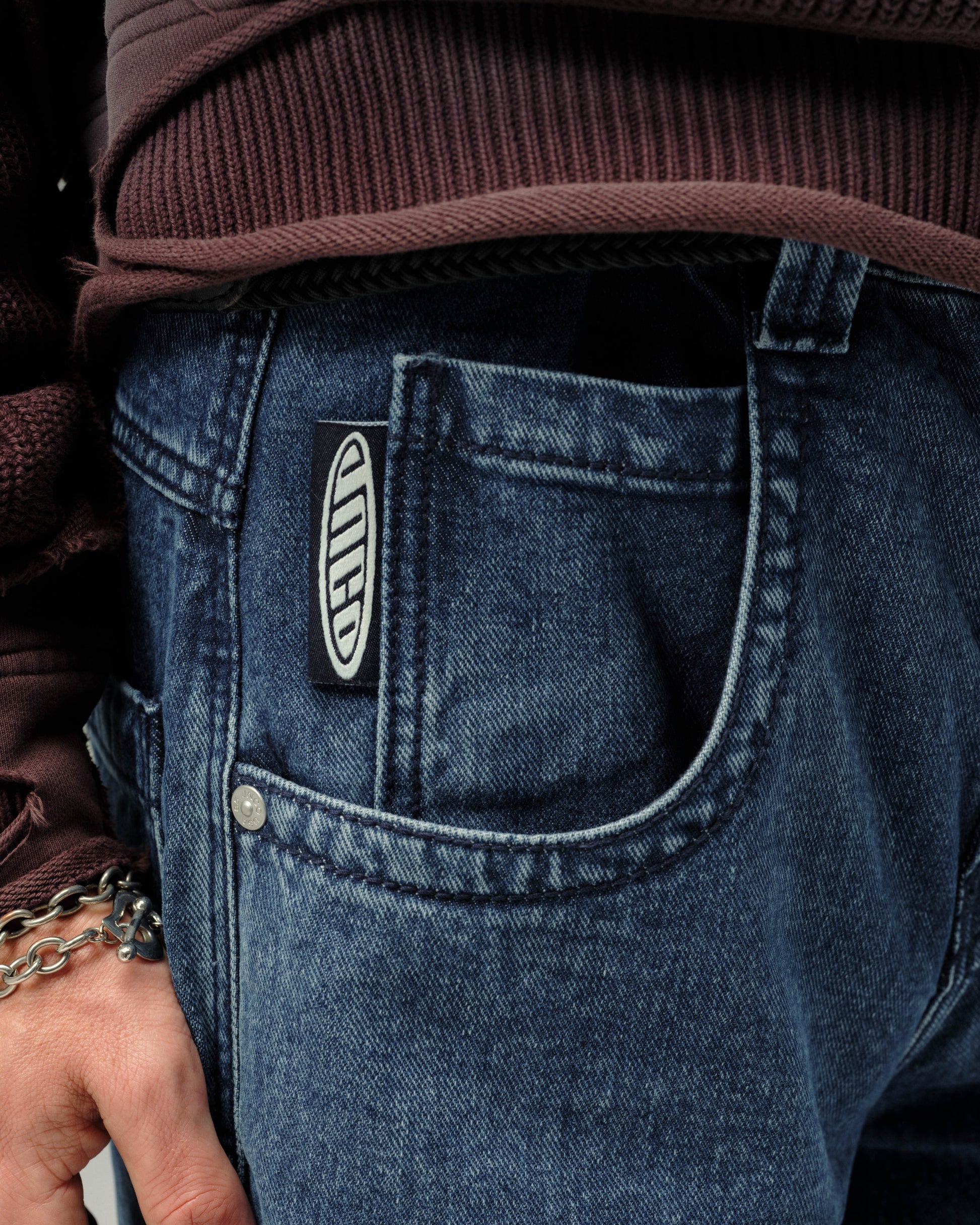 Original Dark Stone Wash, 30" bottom opening. 14oz 100% cotton denim with 3x1 left hand weave. One-of-a-kind collector piece featuring 70,000-stitch JNCO logo on the elongated back pocket. Includes extra-long collectible hangtag sticker. Old School Edition – Tested to Meet Needs.
