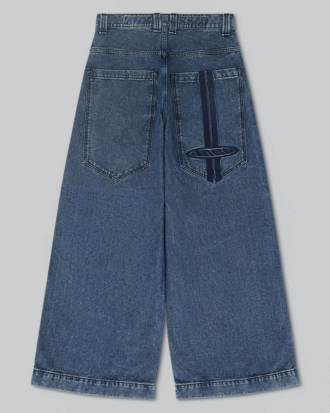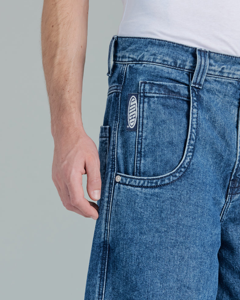Original Dark Stone Wash, 30" bottom opening. 14oz 100% cotton denim with 3x1 left hand weave. One-of-a-kind collector piece featuring 70,000-stitch JNCO logo on the elongated back pocket. Includes extra-long collectible hangtag sticker. Old School Edition – Tested to Meet Needs.