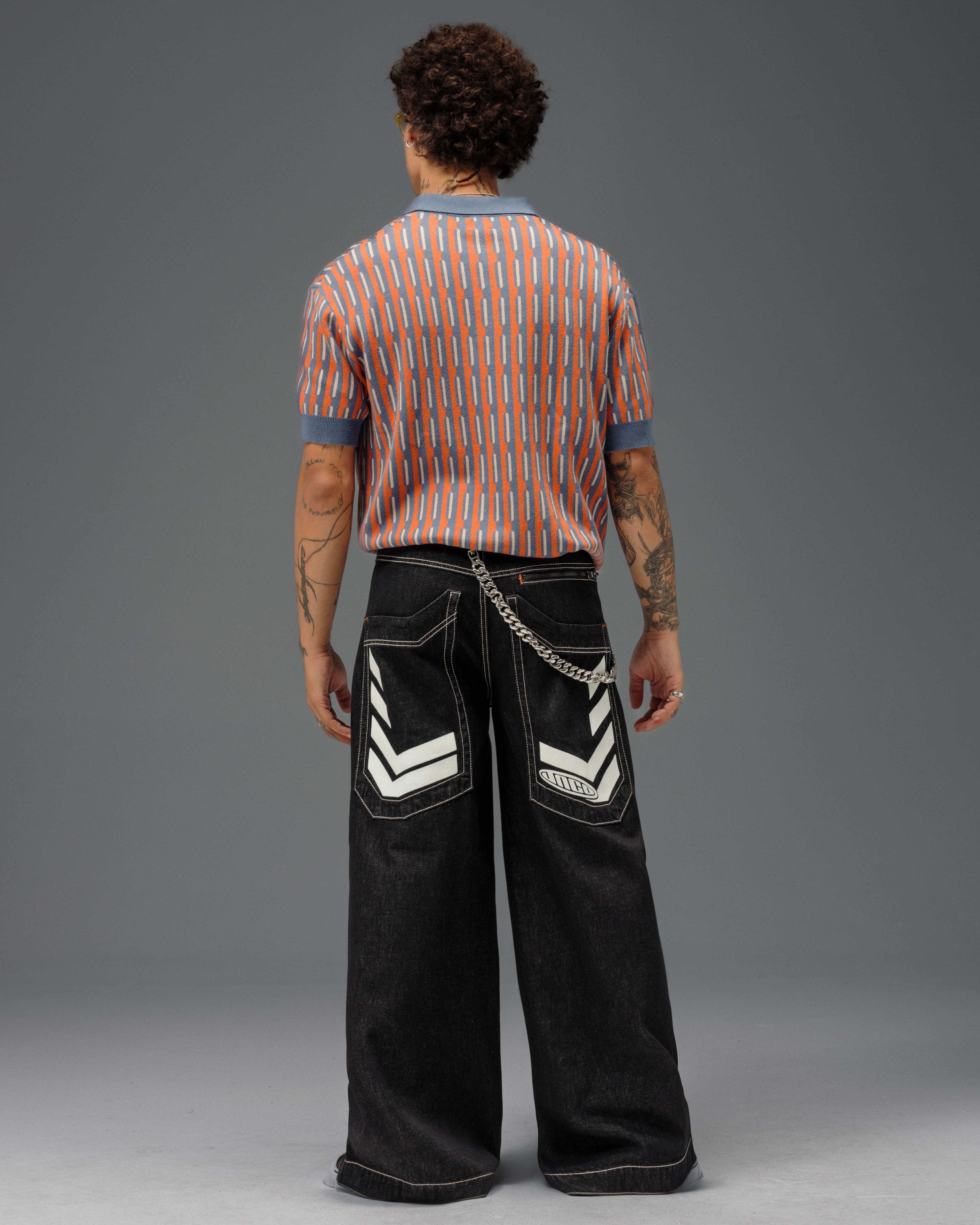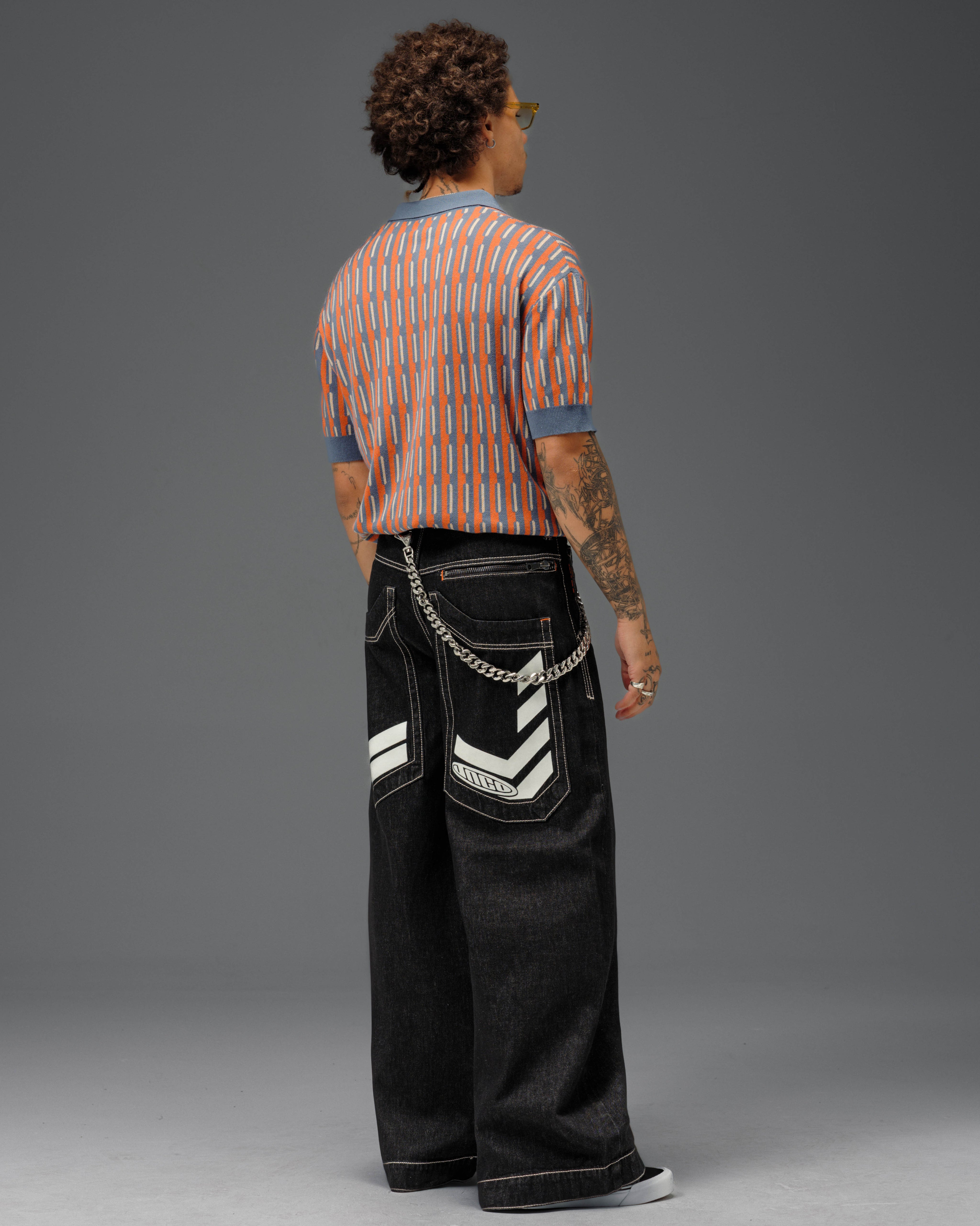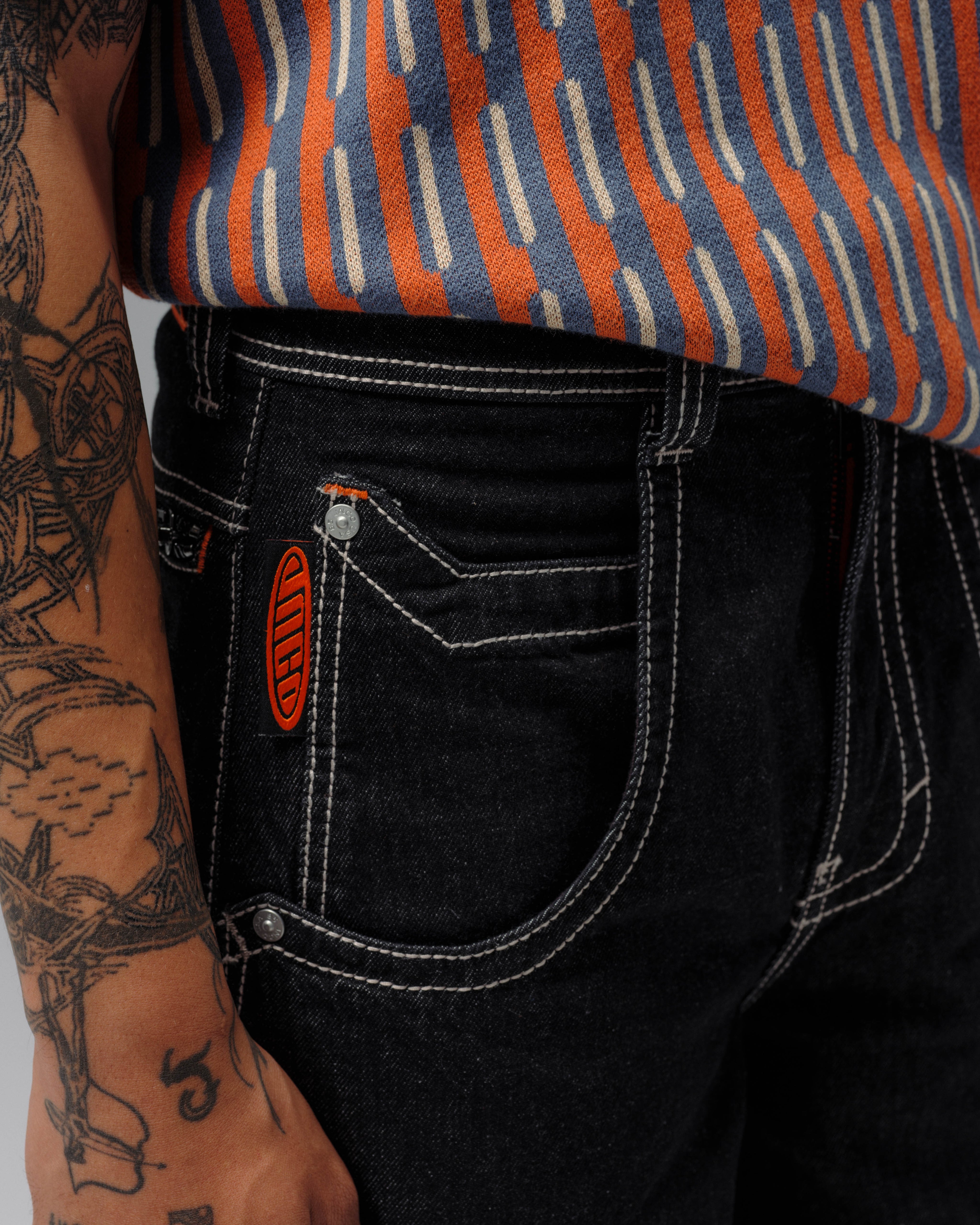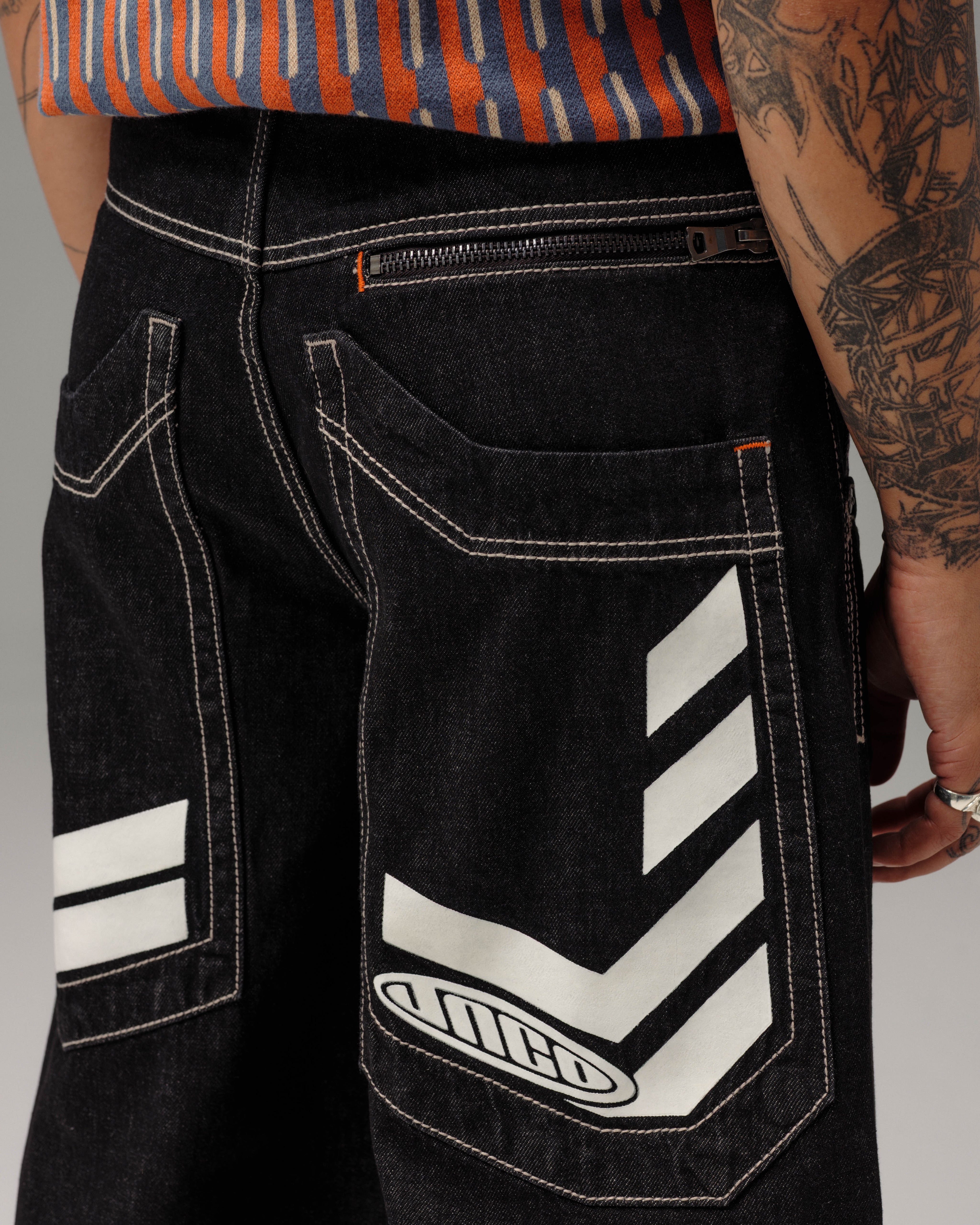 One-of-a-kind collector’s piece in Laser Black with White Warp. 30" bottom opening, 100% cotton rope-dyed denim with a luxe wax finish. Features glow-in-the-dark JNCO caution print on elongated back pocket—charge in sunlight to activate. Orange zipper and stitching, and back yoke zipper pocket. Includes extra-long collectible hangtag sticker. Old School Edition – Tested to Meet Needs.
